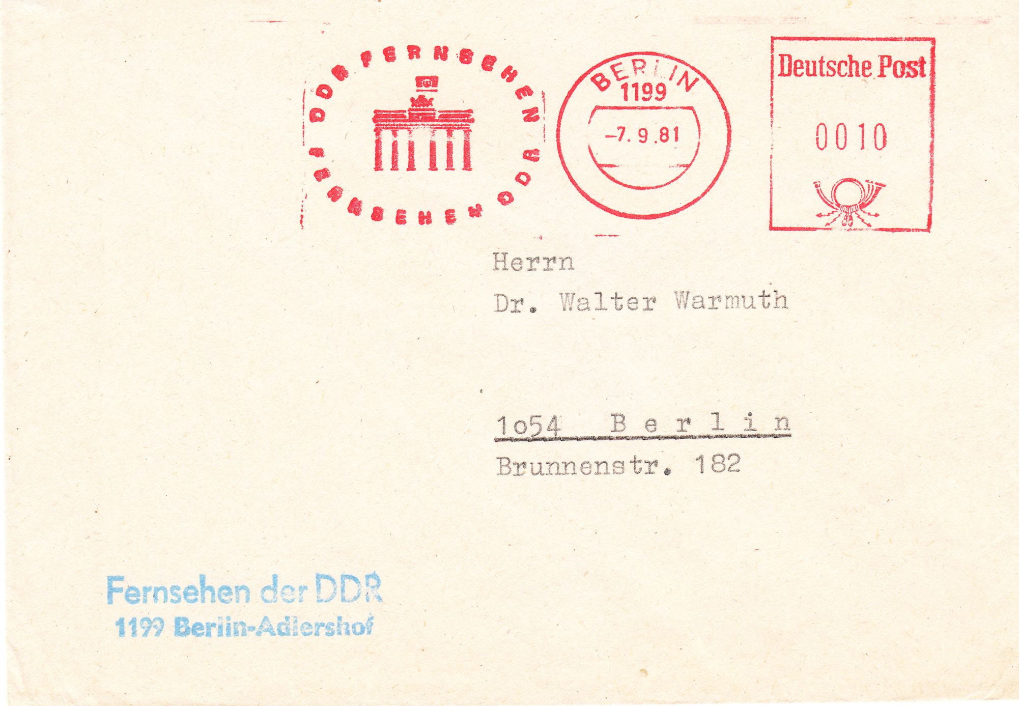 "Deutscher Fernsehfunk" = DFF, zwischen 1972 und 1990 "Fernsehen der DDR", hieß die staatliche Fernsehsendeanstalt der DDR in 1199 Berlin-Adlershof.