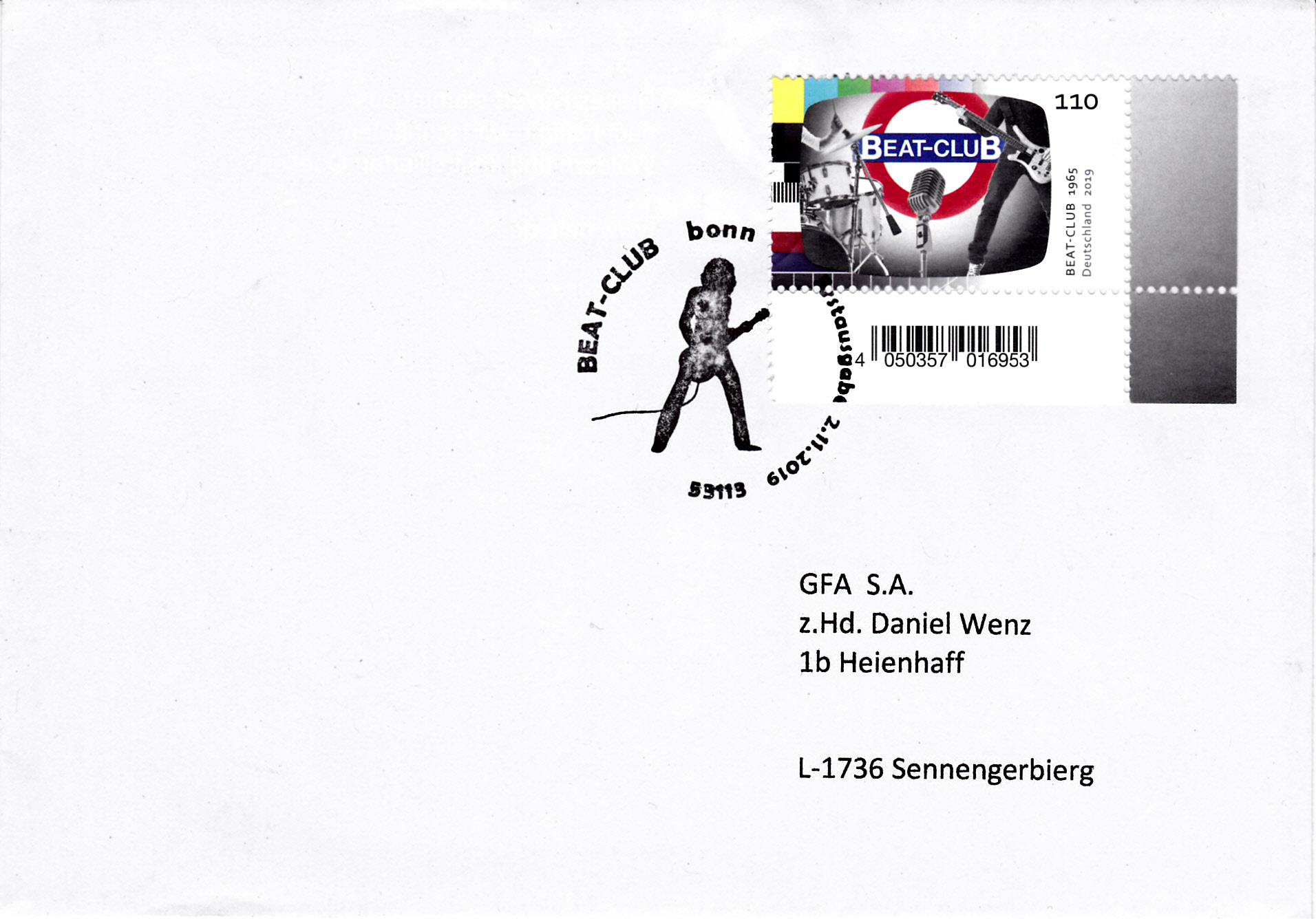 Am 2.11.2019 erschien bei der Deutschen Post in der Serie "Deutsche Fernsehlegenden" eine Marke (MiNr 3503) zum Thema "Beat-Club". Hier eine Marke vom Eckrand mit EAN-Codierung.