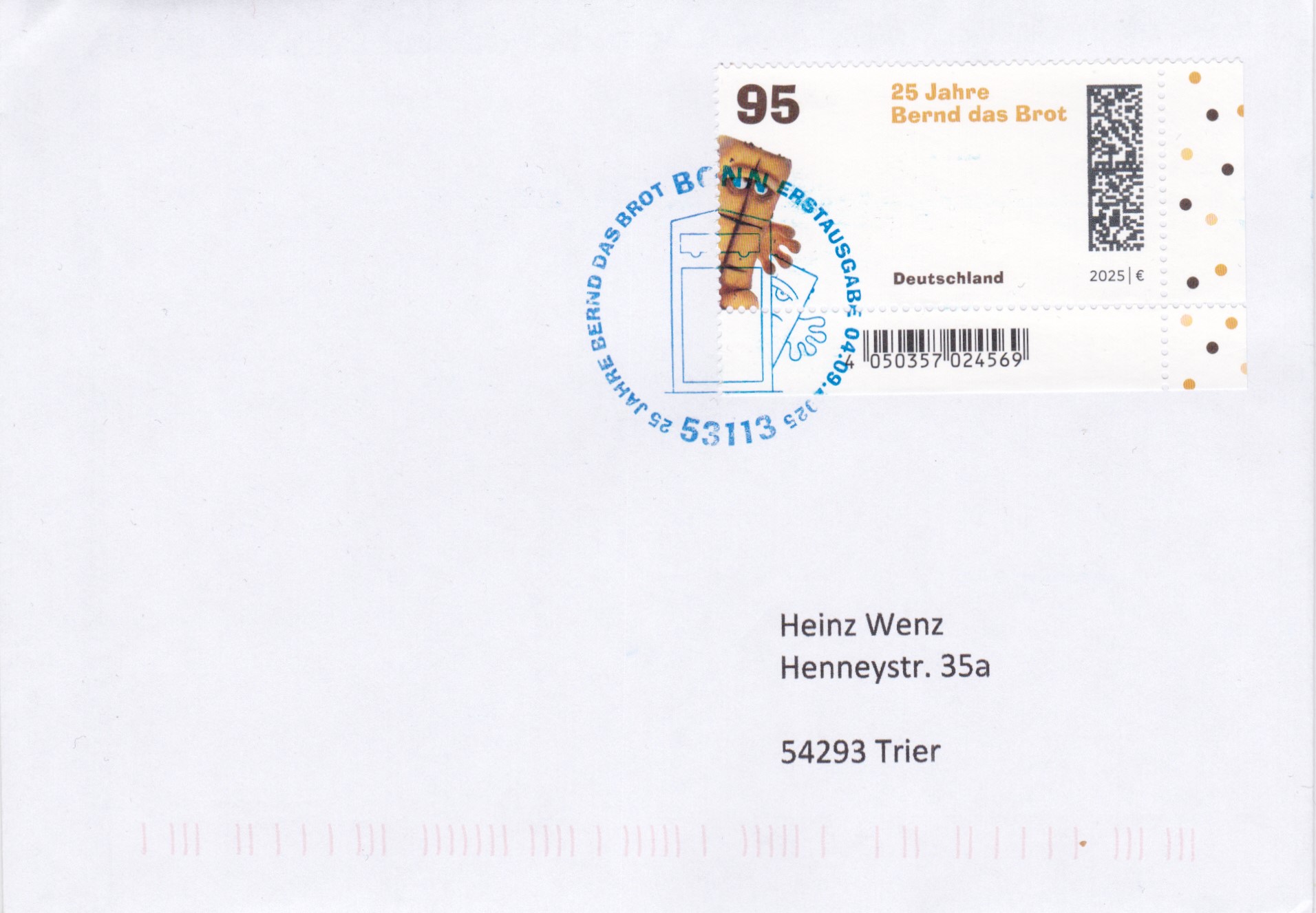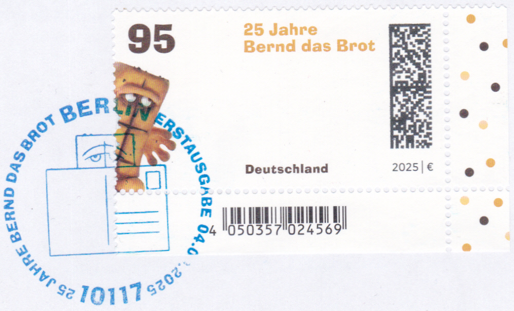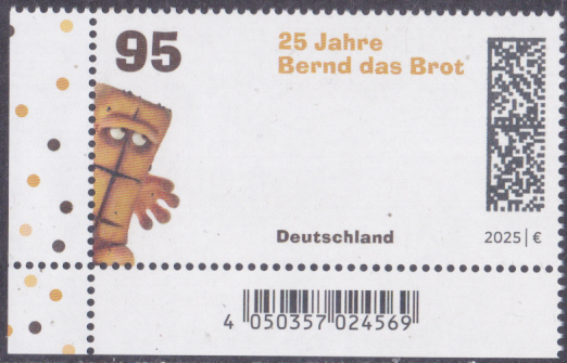 Zum Jubiläum "25 Jahre Bernd das Brot" ist bei der Deutschen Post eine Marke (MiNr 3926) erschienen. Sie zeigt wie Bernd das Brot zögerlich das leere Bild betritt. Hier zeige ich ein Eckrandstück mit EAN-Codierung.