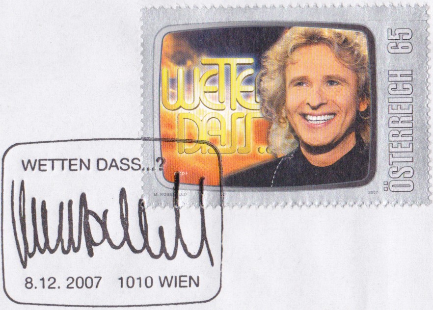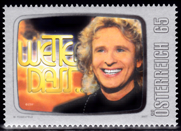 Auf dieser Marke aus Österreich (MiNr 2695) sehen wir Thomas Gottschalk in der Fernsehsendung "Wetten, dass..?"