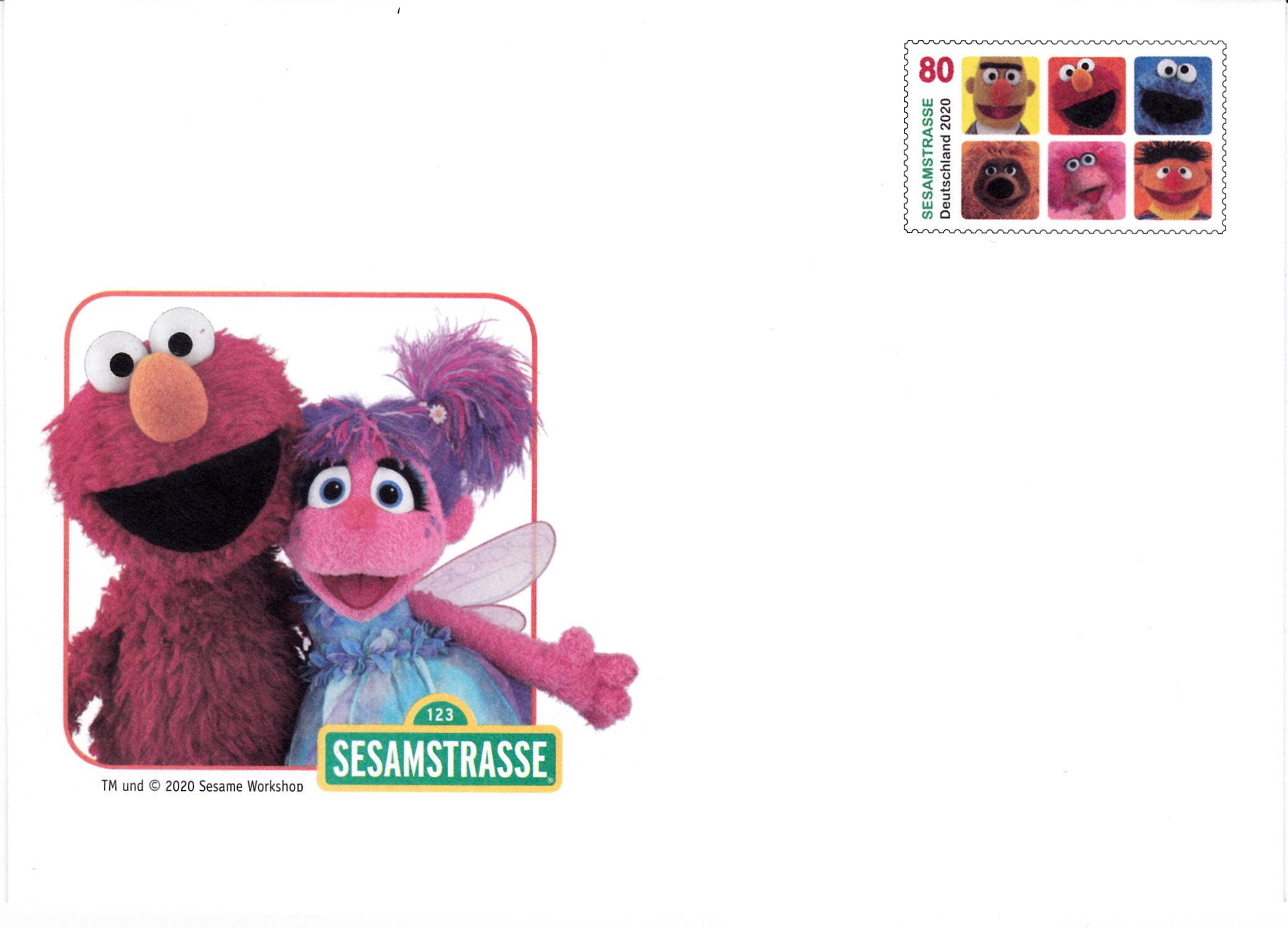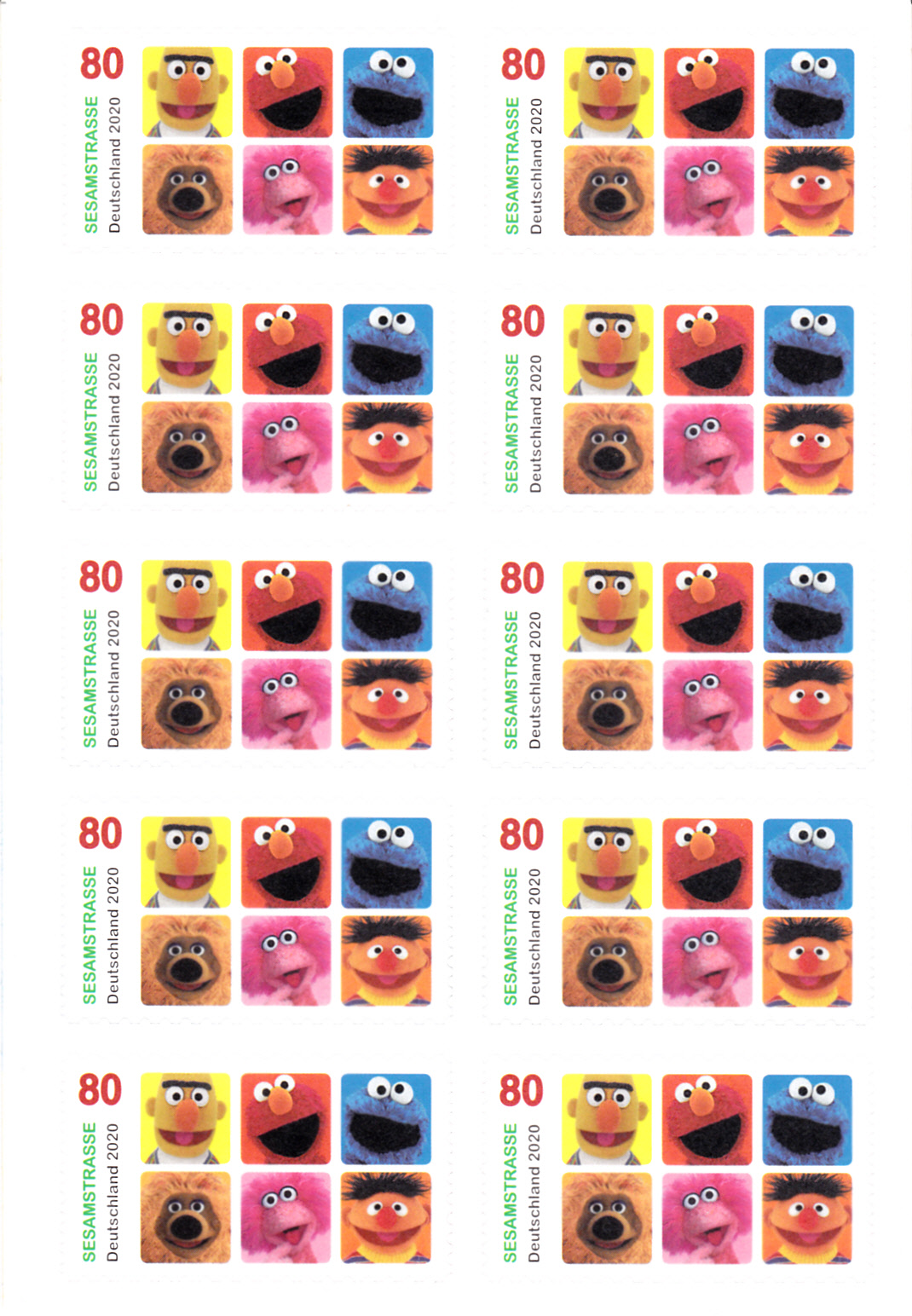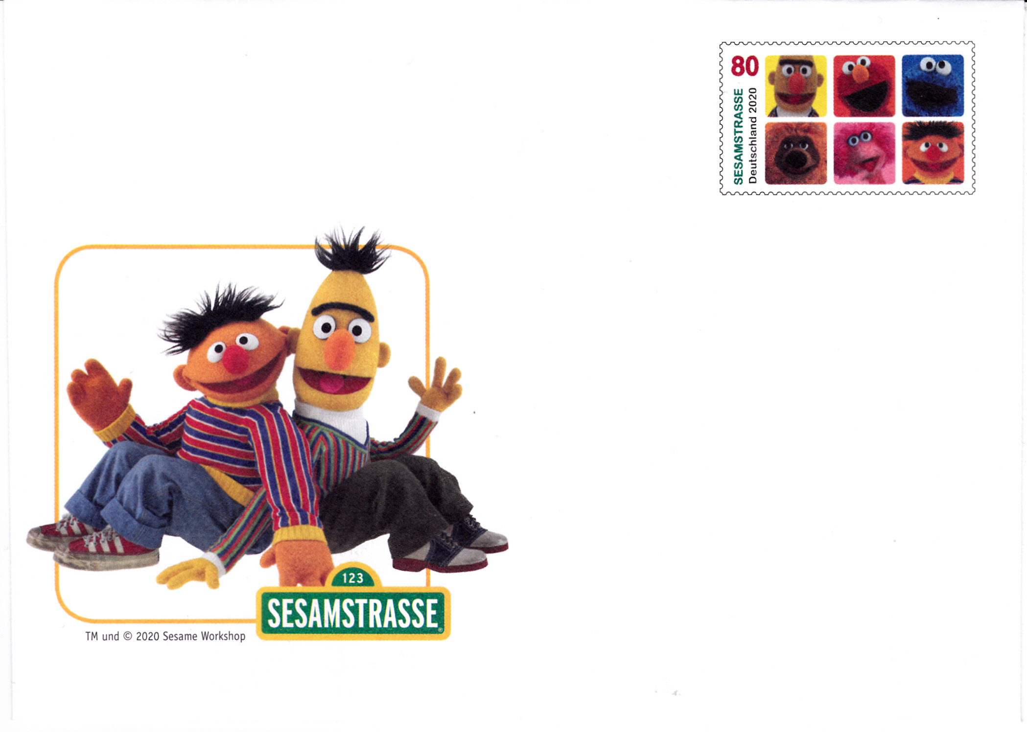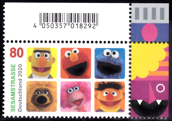 Auf dieser Marke der Deutschen Post (MiNr 3530) sind die Figuren Bert, Elmo, Krümelmonster, Samson, Tiffy und Ernie aus der Kinderfernsehserie "Sesamstraße" zu sehen.