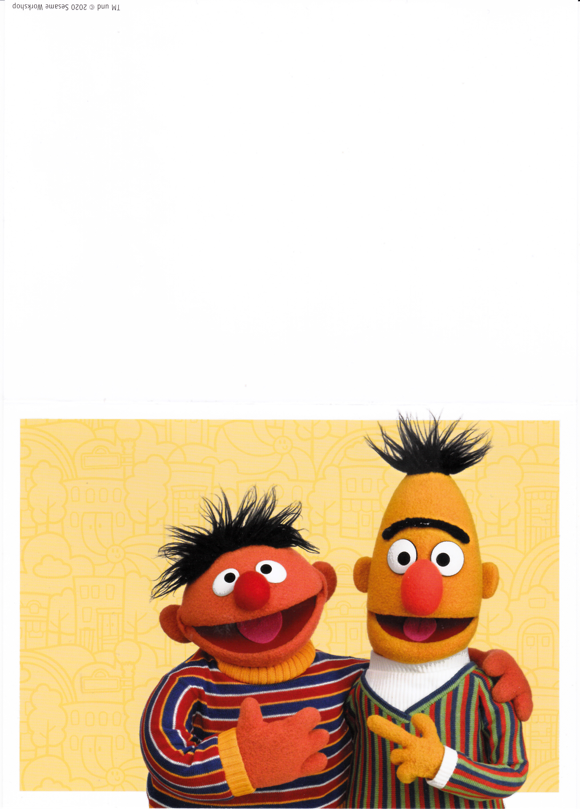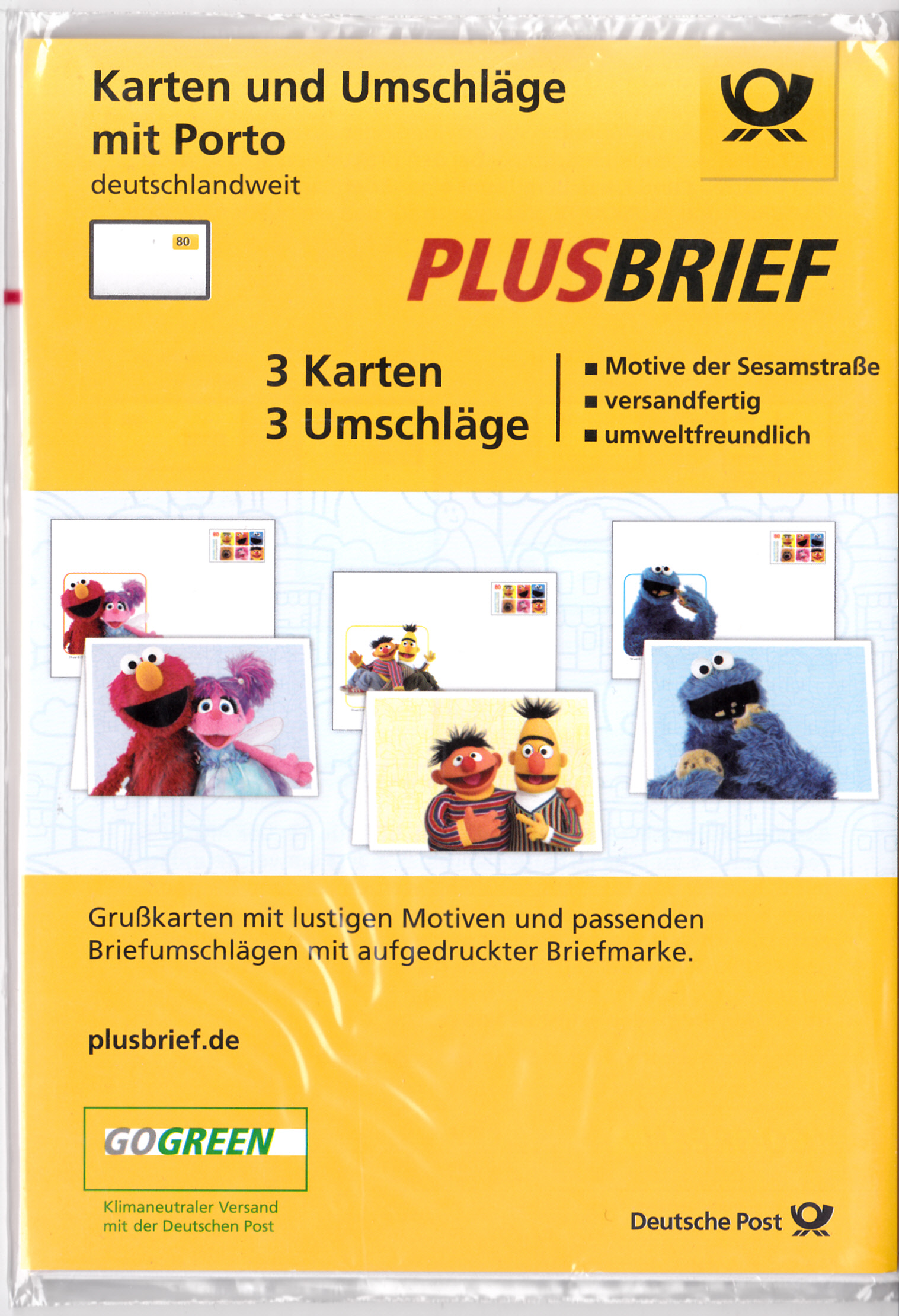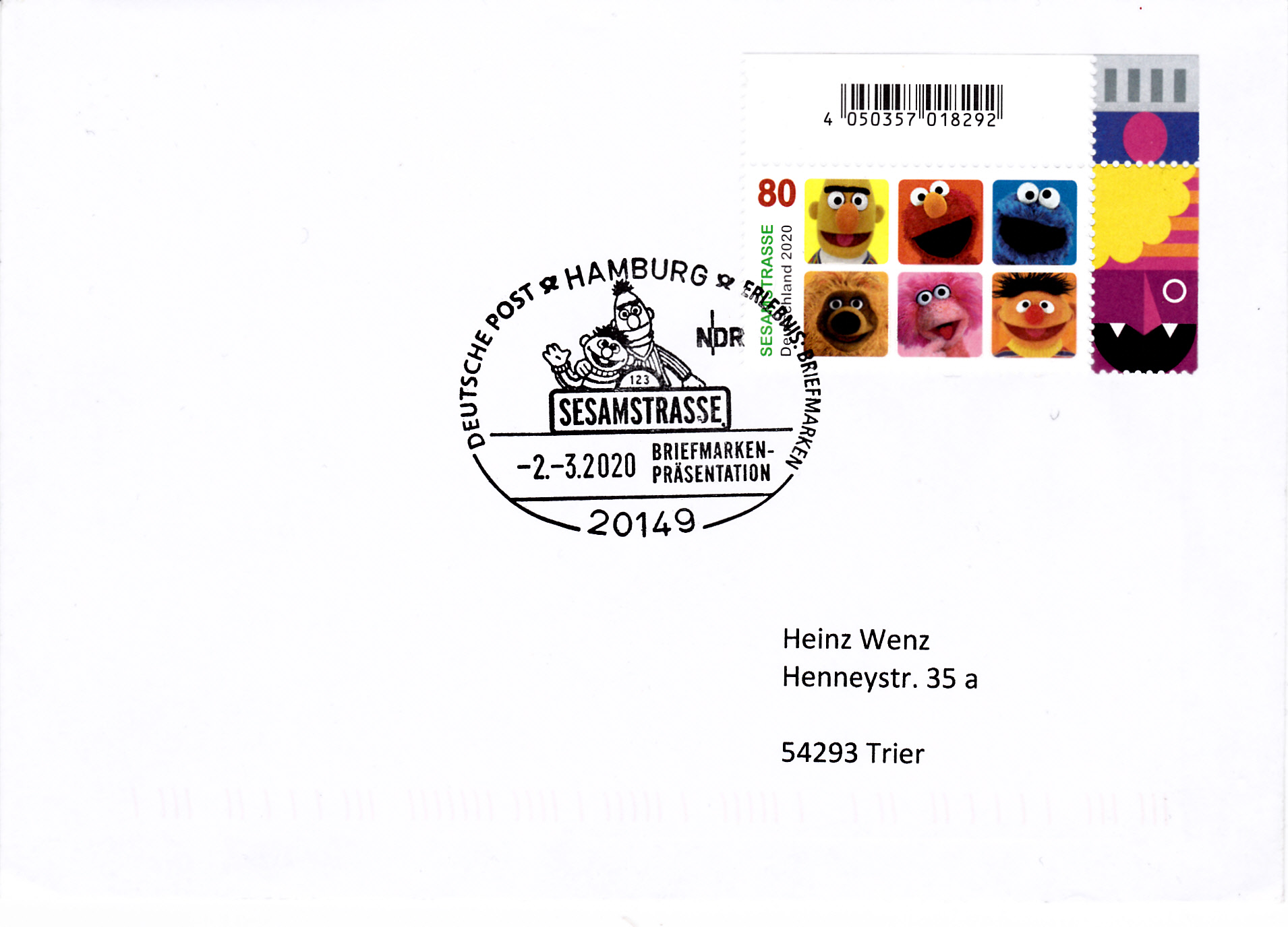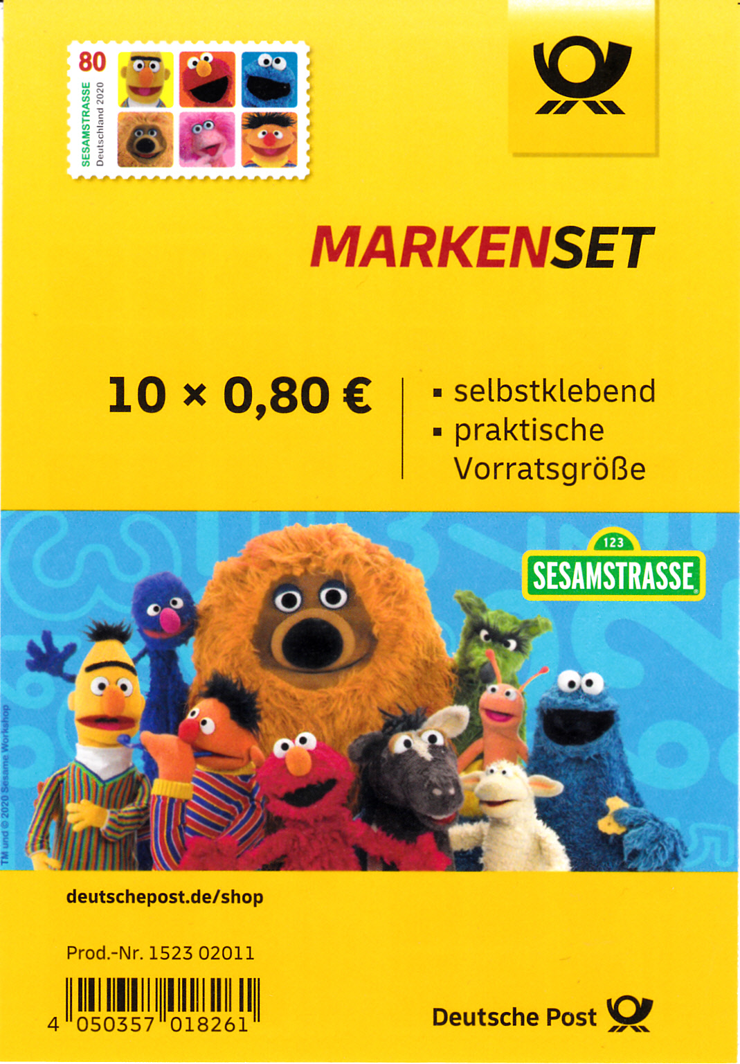 Auf dieser Marke der Deutschen Post (MiNr 3530) sind die Figuren Bert, Elmo, Krümelmonster, Samson, Tiffy und Ernie aus der Kinderfernsehserie "Sesamstraße" zu sehen.