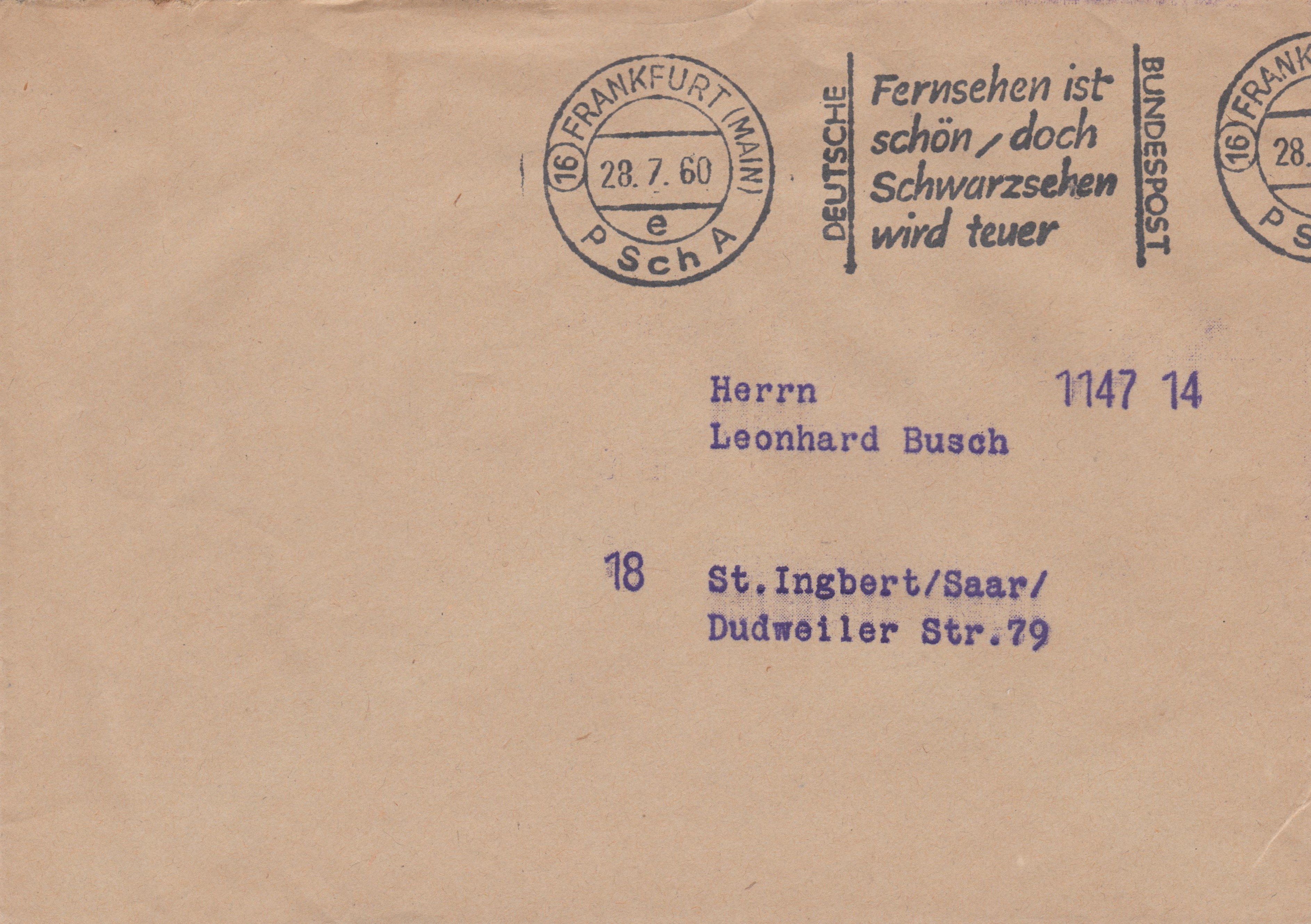 Portofreie Postsache mit einem Maschinenstempel vom Postscheckamt (= "P Sch A") Frankfurt (Main) vom 28.07.1960 mit Werbeeinsatz "Schwarzsehen wird teuer":