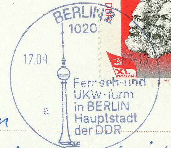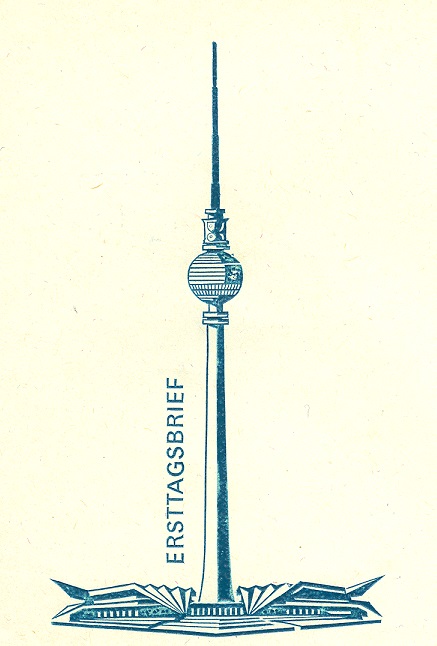 Das sind zwar nicht die ersten Abbildungen des Berliner Fernsehturms auf Briefmarken, aber die Motivhäufung auf diesem Umschlag lässt kaum Zweifel an der Wichtigkeit des realen Turms in Berlin-Mitte.