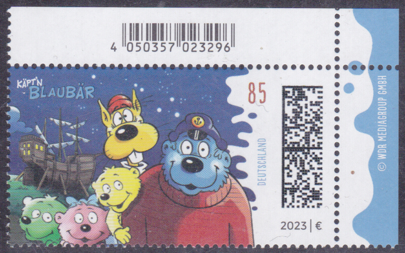 Bei der Deutschen Post ist eine Marke (MiNr 3803) in der Serie "Helden der Kindheit" erschienen. Sie zeigt Käpt’n Blaubär mit seinen Enkelkindern und Leichtmatrose Hein Blöd vor dem gestrandeten Kutter Elvira. Ich stelle hier eine Marke vom Eckrand mit EAN-Codierung vor.