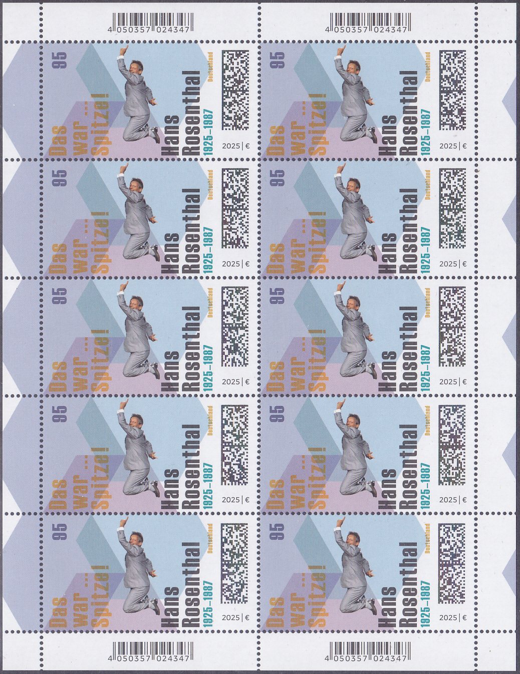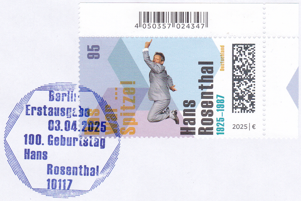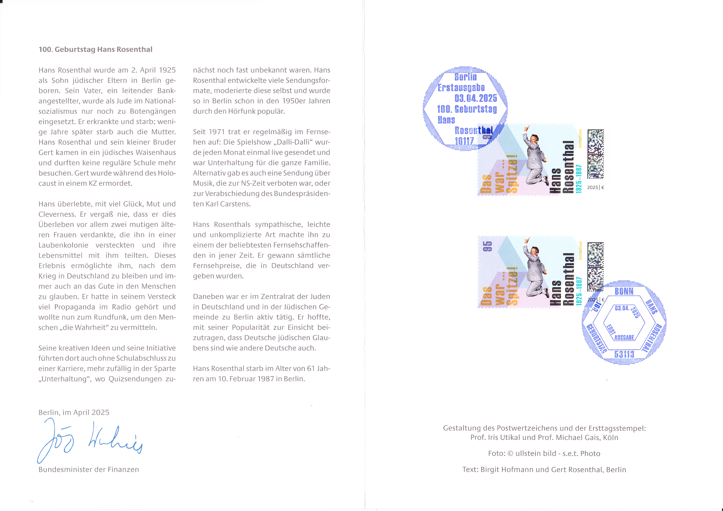 Ministerkarte des Bundesministers für Finanzen mit zwei Marken zum 100. Geburtstag von Hans Rosenthal (MiNr 3901) mit Hans Günter Rosenthal beim Luftsprung in der Unterhaltungssendung "Dalli Dalli" und den beiden Ersttagsonderstempel Bonn und Berlin.
