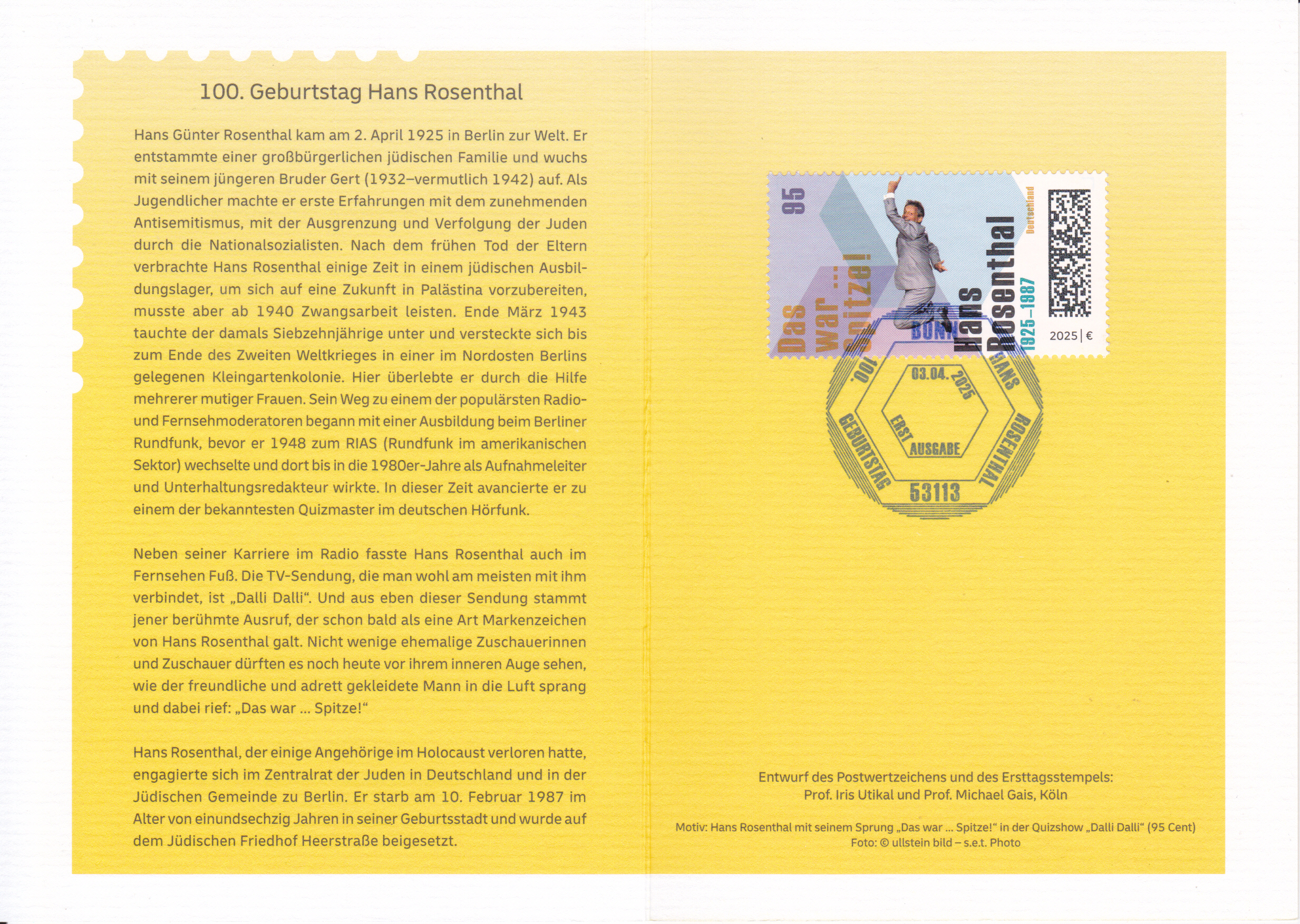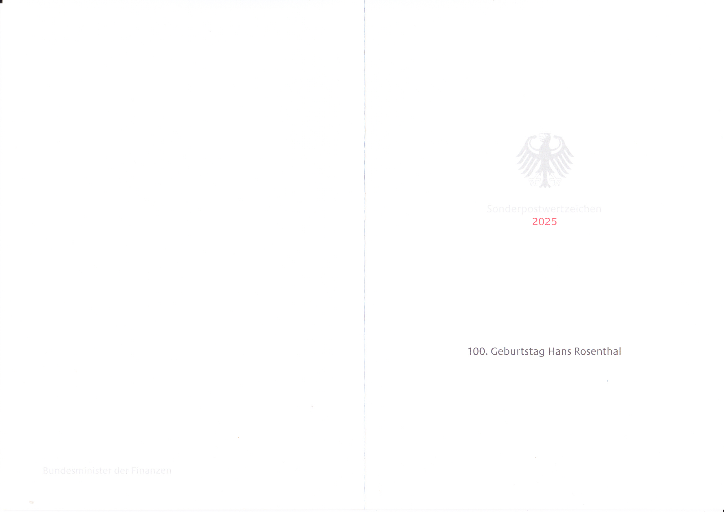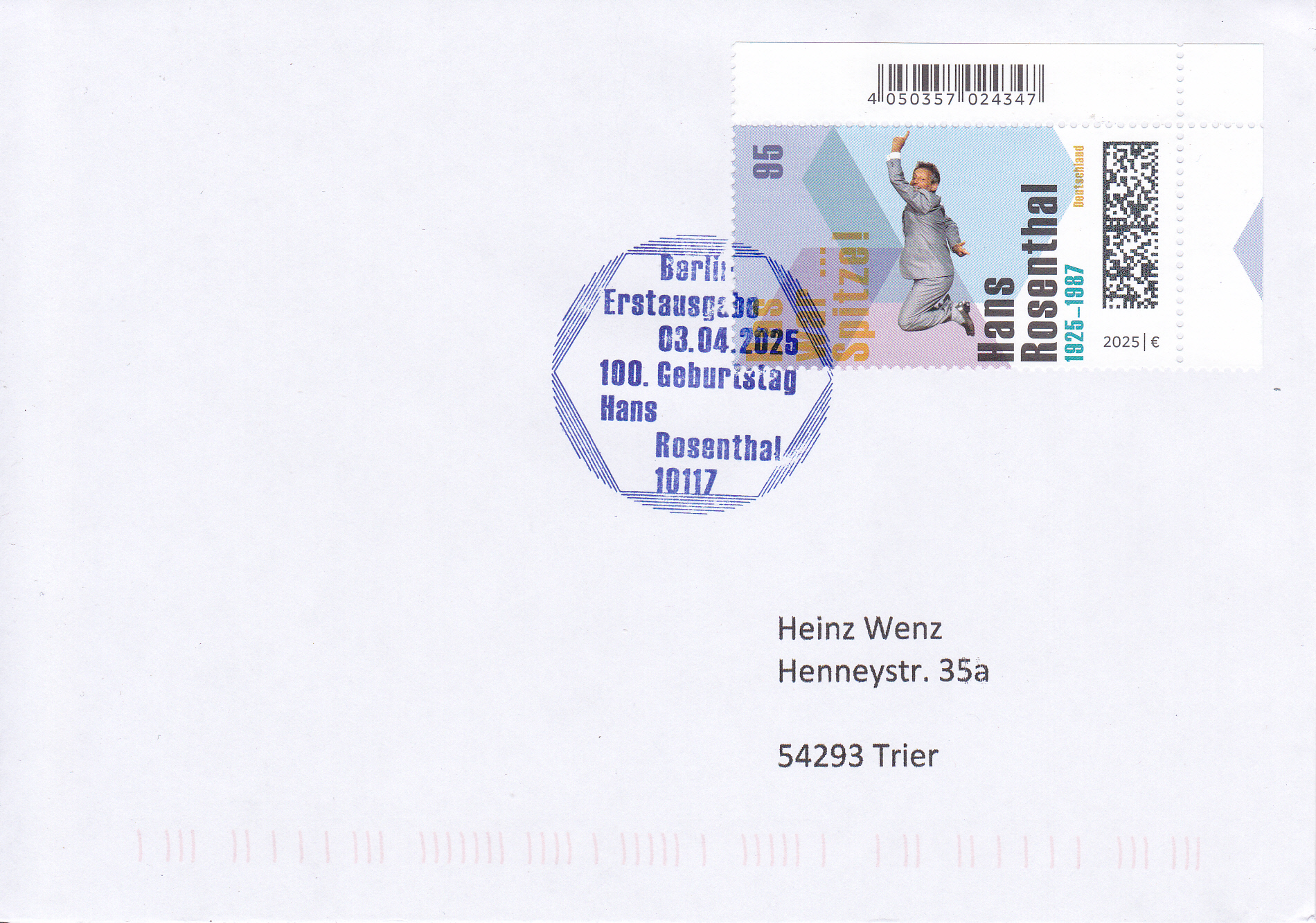 Ministerkarte des Bundesministers für Finanzen mit zwei Marken zum 100. Geburtstag von Hans Rosenthal (MiNr 3901) mit Hans Günter Rosenthal beim Luftsprung in der Unterhaltungssendung "Dalli Dalli" und den beiden Ersttagsonderstempel Bonn und Berlin.