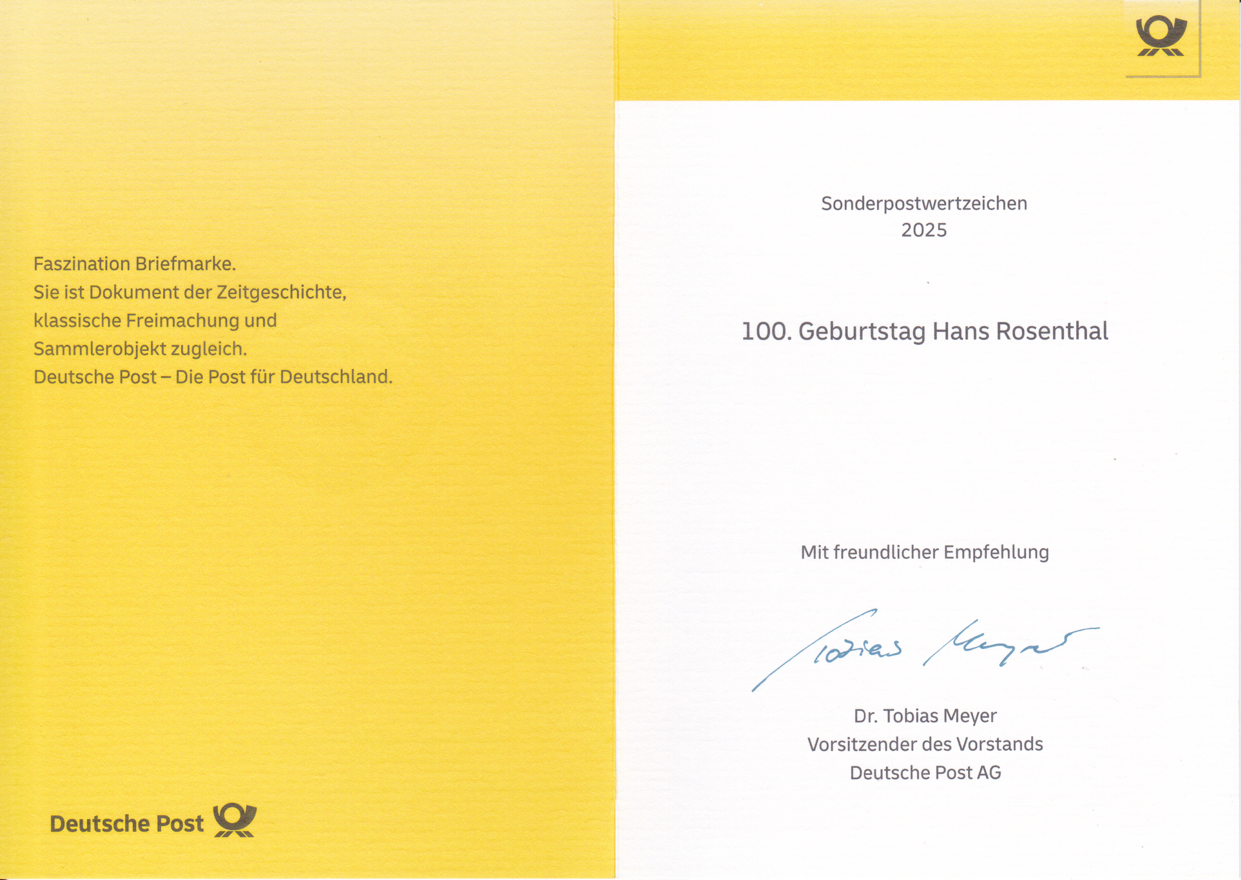 Klappkarte des Vorstandsvorsitzenden der Deutschen Post AG mit der Marke (MiNr 3901) zum 100. Geburtstag von Hans Rosenthal und dem Ersttagsonderstempel Bonn.