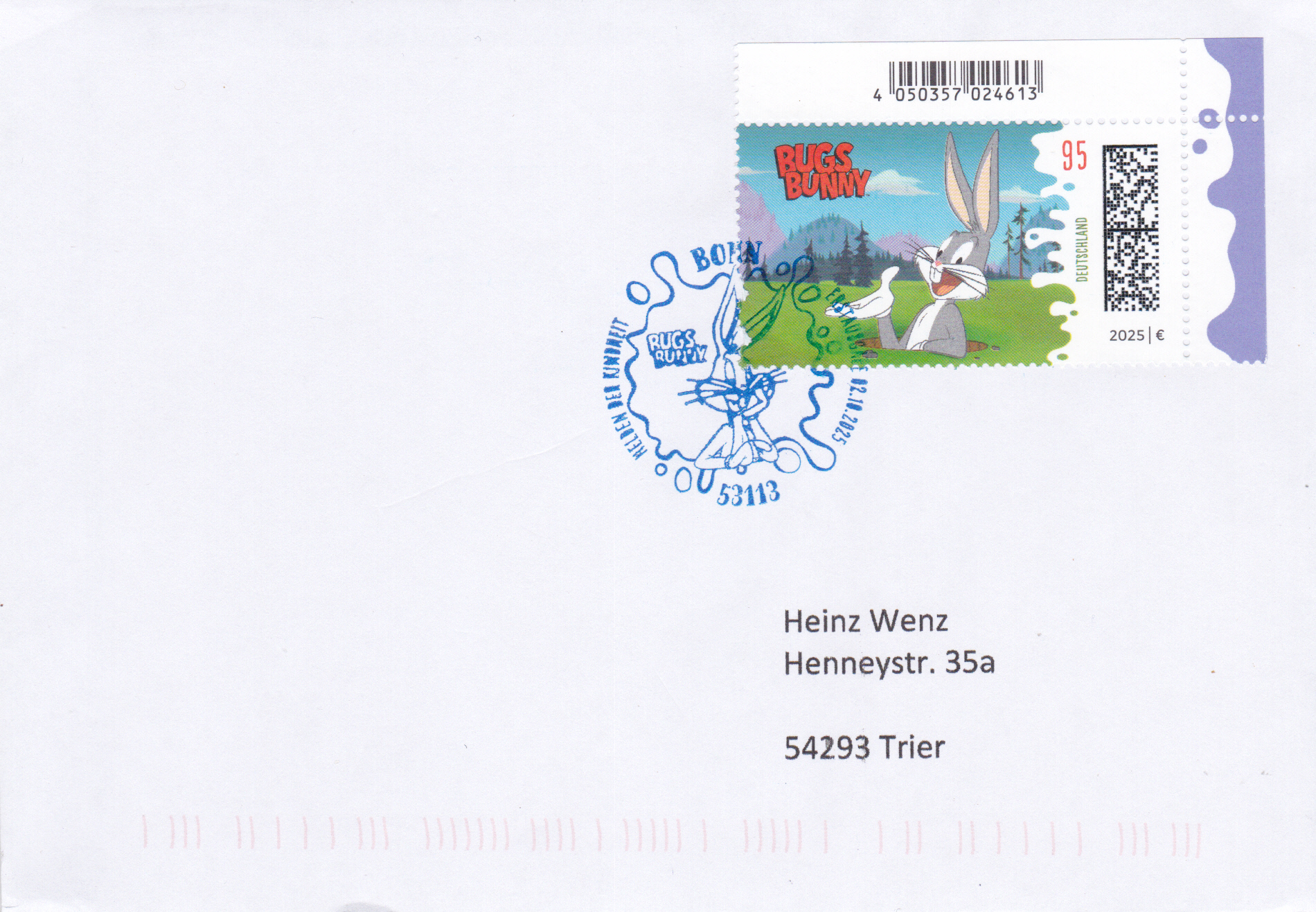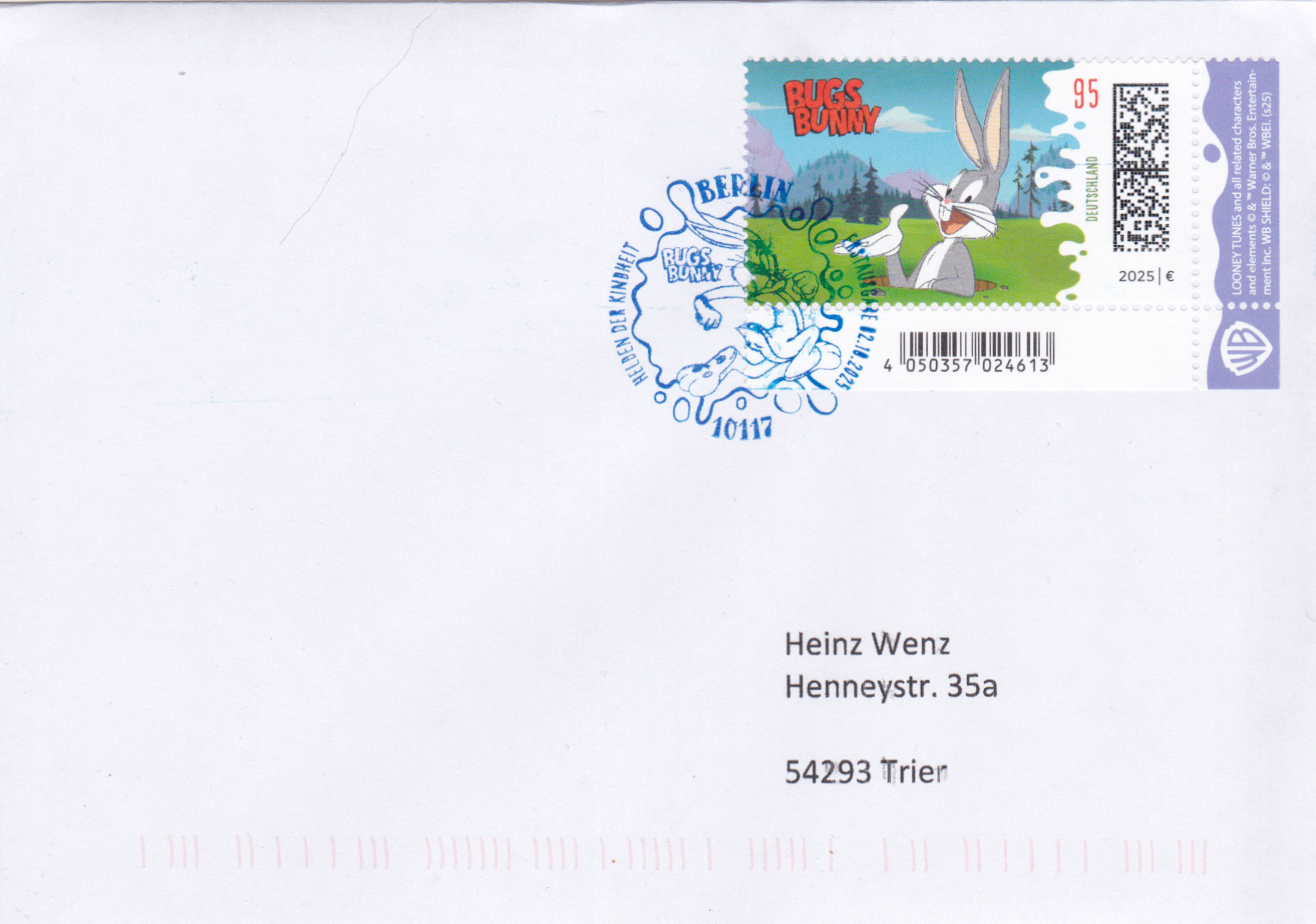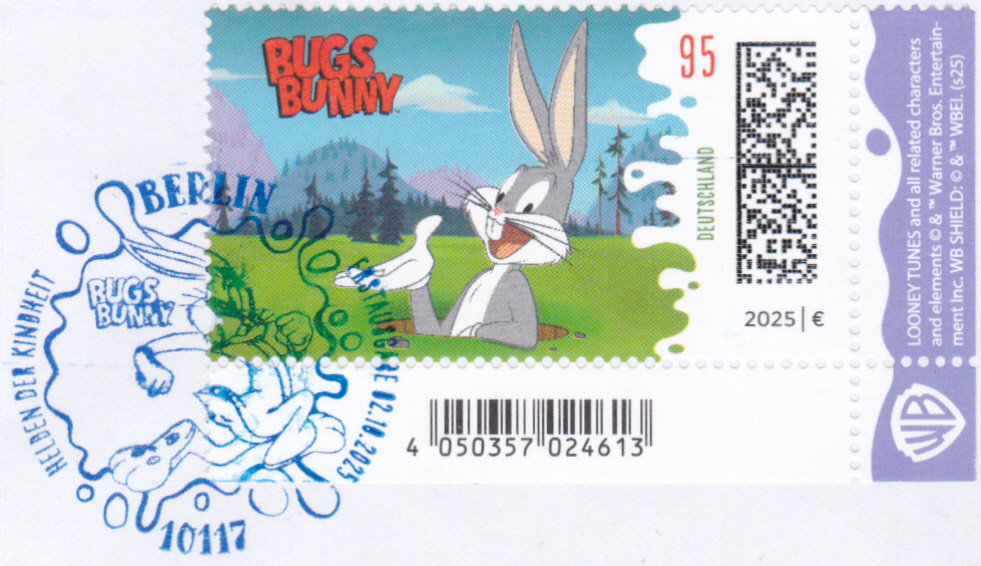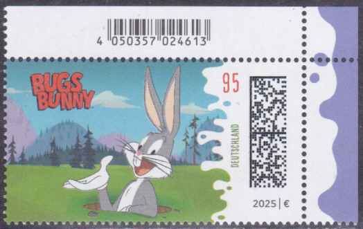 In der Serie "Helden der Kindheit" ist bei der Deutschen Post eine Marke (MiNr 3928) mit der Zeichentrickfigur der Warner-Brothers-Trickfilmstudios "Bugs Bunny in seinem Erdloch" erschienen. Hier zeige ich eine Marke vom Eckrand mit EAN-Codierung.