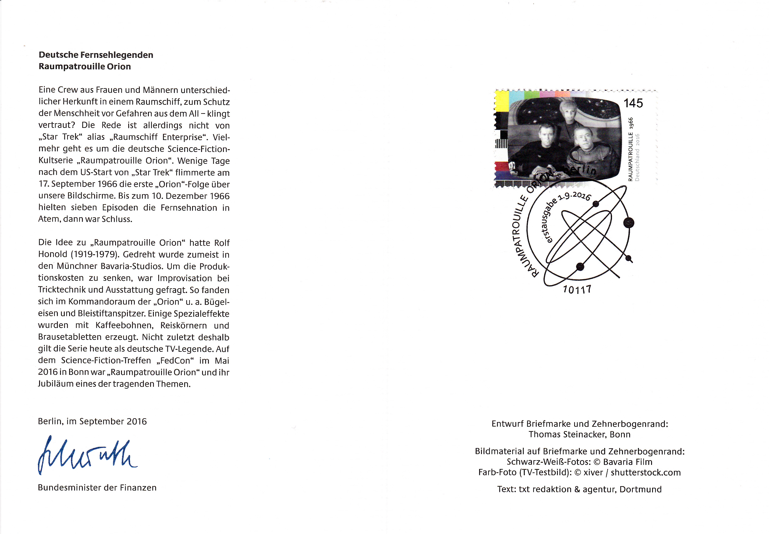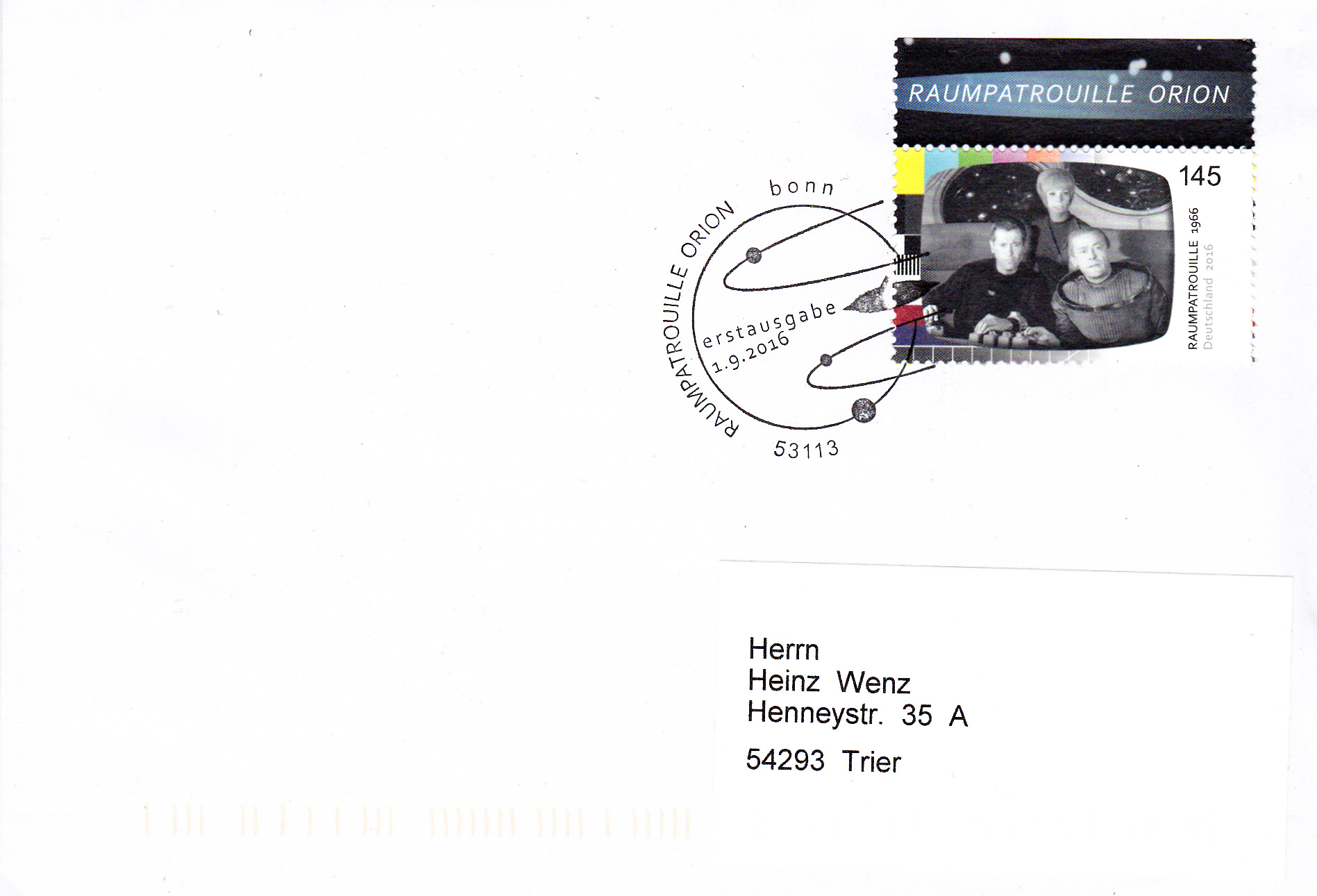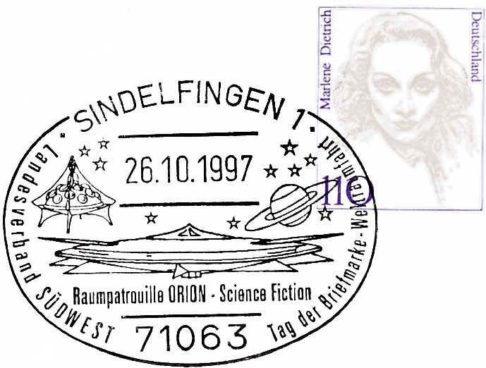 Beim Landesverband Südwestdeutscher Briefmarkensammlervereine e.V. wurden auf dem Ganzsachenumschlag zzmm Tag der Briefmarke 1997 und für den Sonderstempel vom 26.10.1997 aus Sindelfingen Motive zur TV-Serie Raumpatrouille ORION ausgewählt.