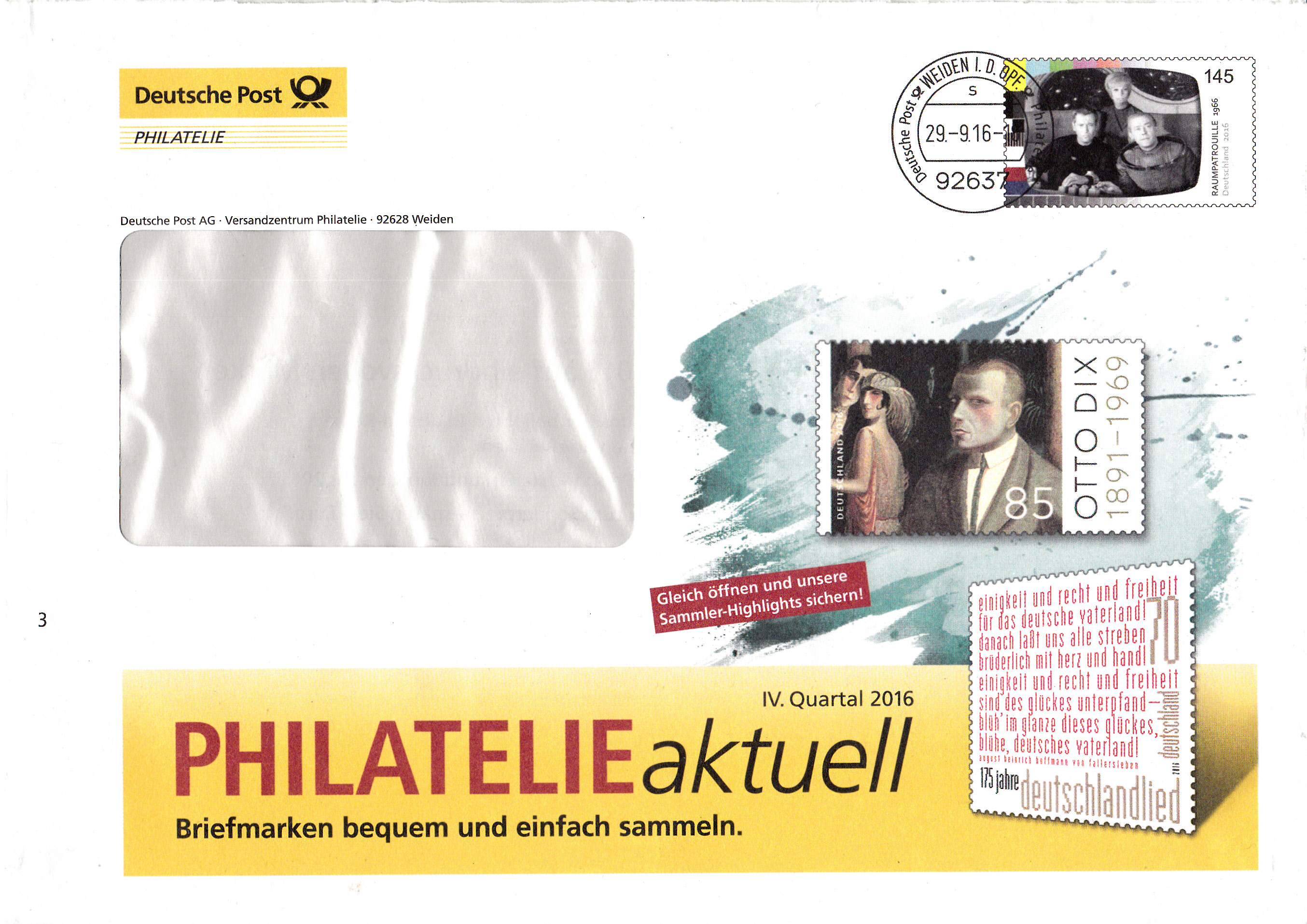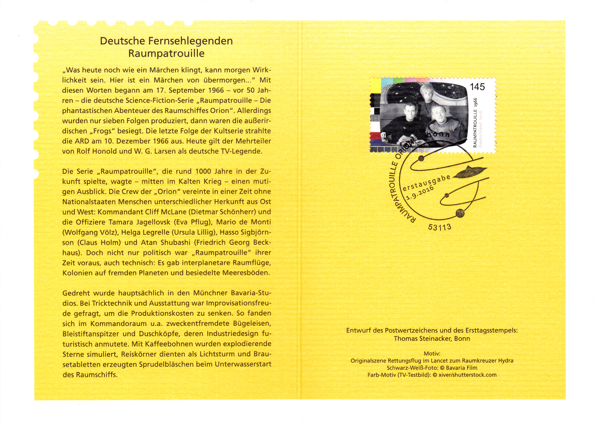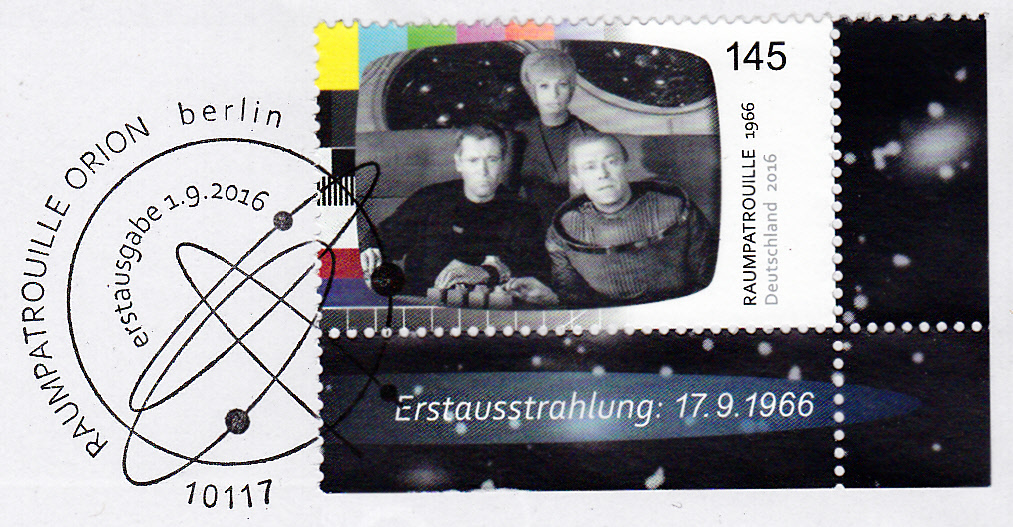 Bei der Deutschen Post AG gab es am 1.9.2016 zum Jubiläum 50 Jahre „Raumpatrouille Orion" diese Sondermarke (MiNr 3260). Im Markenbild wird eine Originalszene mit Dietmar Schönherr, Eva Pflug und Wolfgang Völz (Cliff McLane, Tamara Jagellovsk und Mario de Monti bei Rettungsflug im Lancet zum Raumkreuzer Hydra) gezeigt.