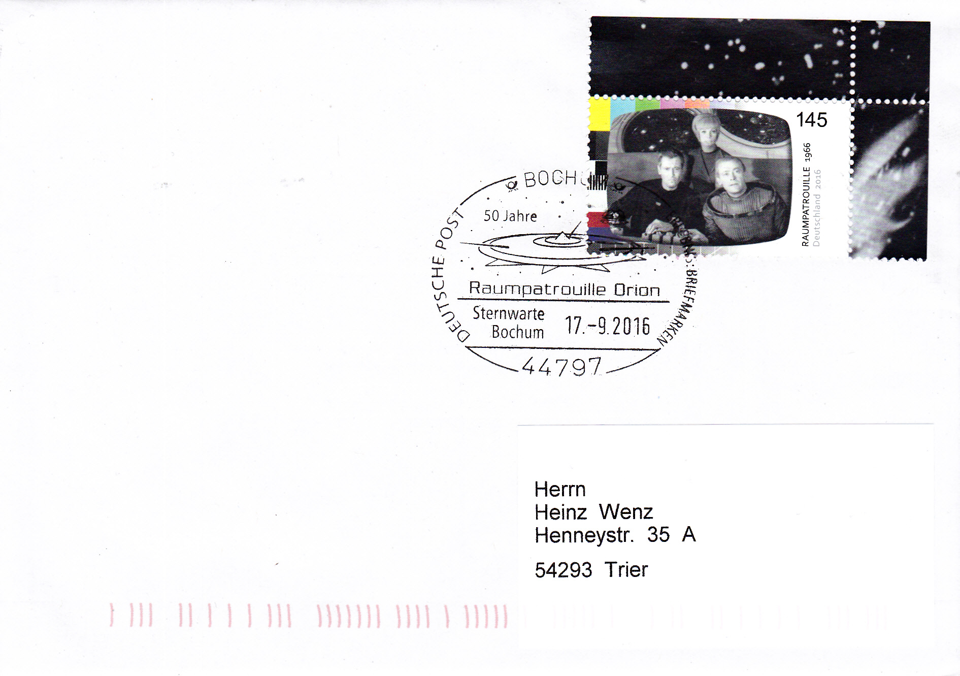 Sonderstempel vom 17.9.2016 aus Bochum zum Jubiläumstag "50 Jahre Raumpatrouille Orion" in der Sternwarte Bochum. Im Stempelbild wird das Raumschiff "Orion" im Weltraum dargestellt.