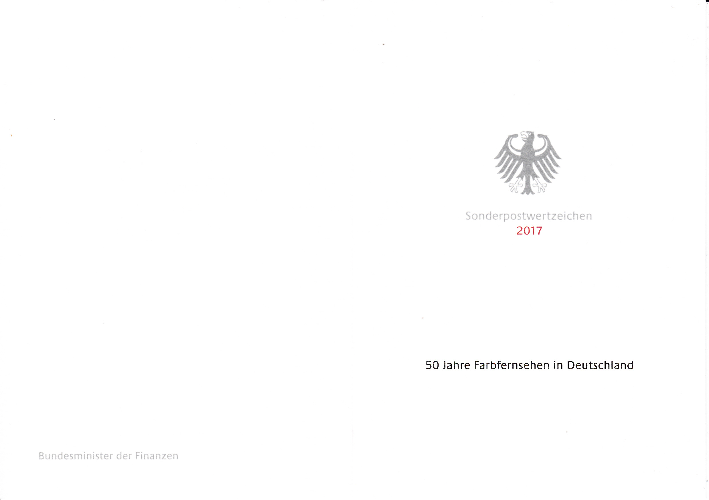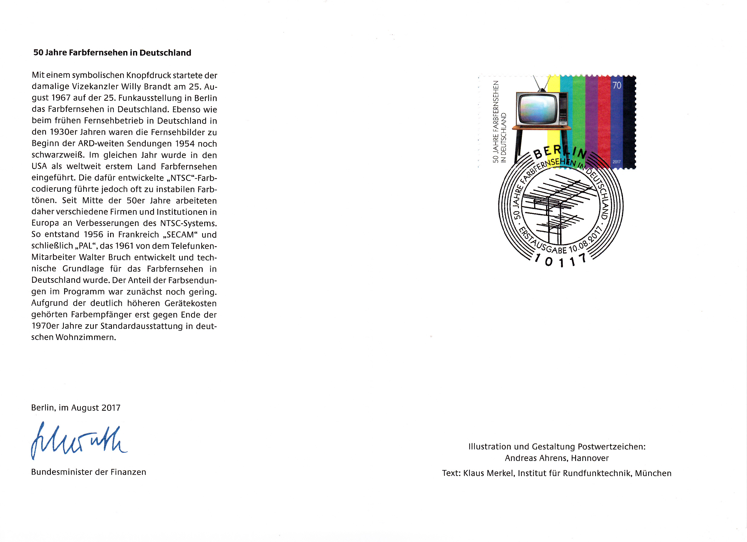Ministerkarte des Finanzministers mit der Marke "50 Jahre Farbfernsehen" und dem Ersttagsonderstempel aus Berlin: