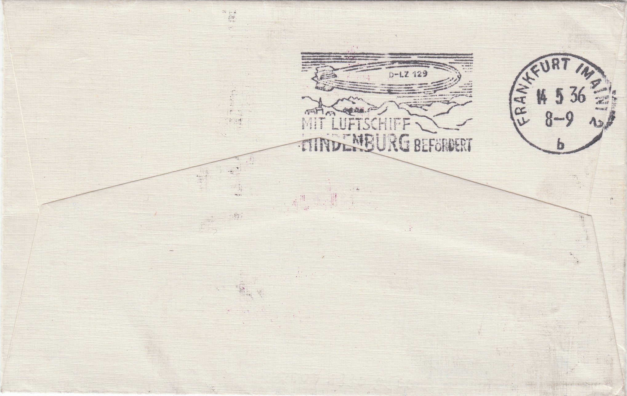 LZ 129 HINDENBURG startete am 12.05.1936 um 03:28 Uhr in Lakehurst und kam am 14.05.1936 um 04:41 Uhr in Frankfurt an. Post aus den Vereinigten Staaten erhielt rückseitig einen Ankunftsstempel, wobei mehrere verschiedene Typen vorkommen. Bei diesem Brief wurde ein Maschinenstempel mit Unterscheidungsbuchstabe "b" abgeschlagen: