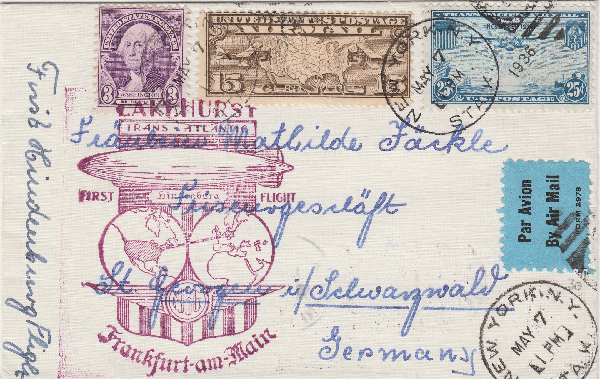 Dieser am 07.05.1936 in New York aufgegebene Brief wurde als Zuleitungspost aus den USA auf der Rückfahrt zur 1. Nordamerikafahrt von LZ 129 HINDENBURG von Lakehurst nach Frankfurt befördert: