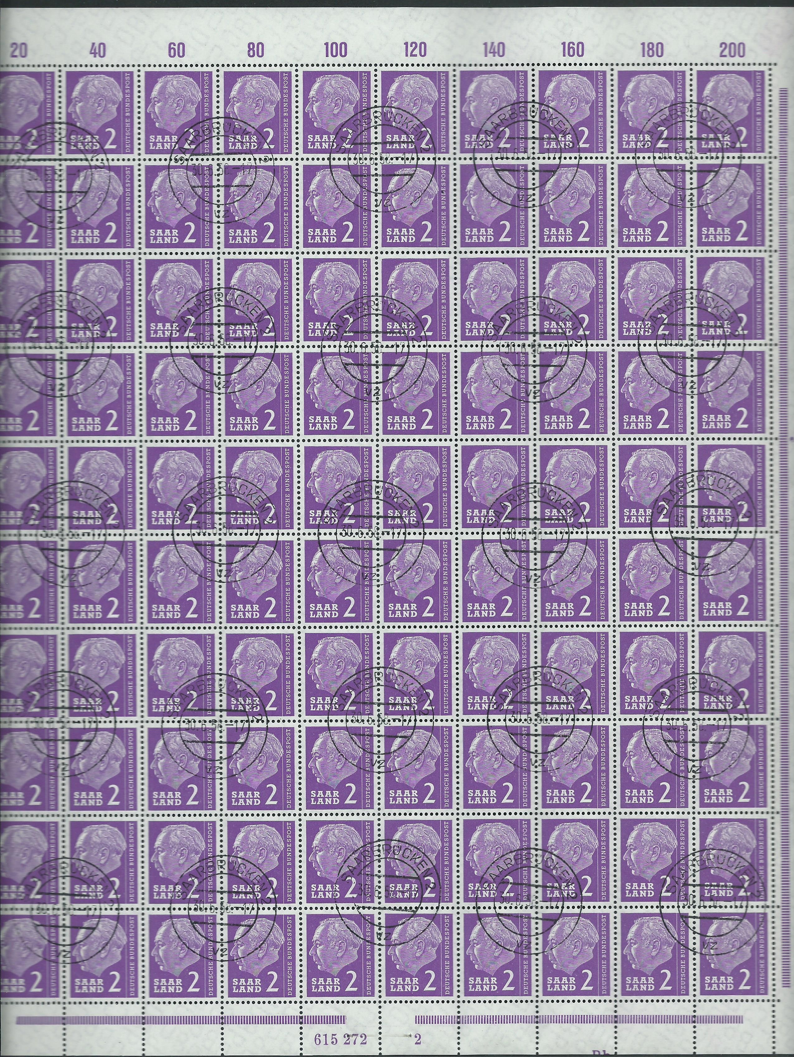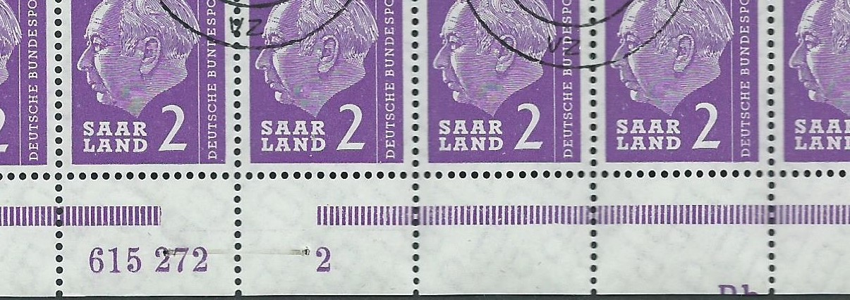 Und einmal mit der HAN 615272 2, ebenfalls mit Stempel Saarbrücken 30.6.58. Auf diesem Bogenunterrand ist sogar noch ein Teil vom Druckerzeichen Rb zu sehen. Durch den Bogenschnitt ist es leider nicht mehr komplett sichtbar, zählt aber als vollwertiges Stück.