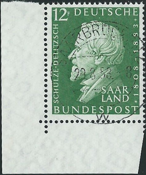 Es folgt ein linkes unteres Eckradstück der Ausgabe „150. Geburtstag Schulze-Delitsch“ (Mi.Nr. 438) mit Stempel Saarbrücken vom 29.8.58.