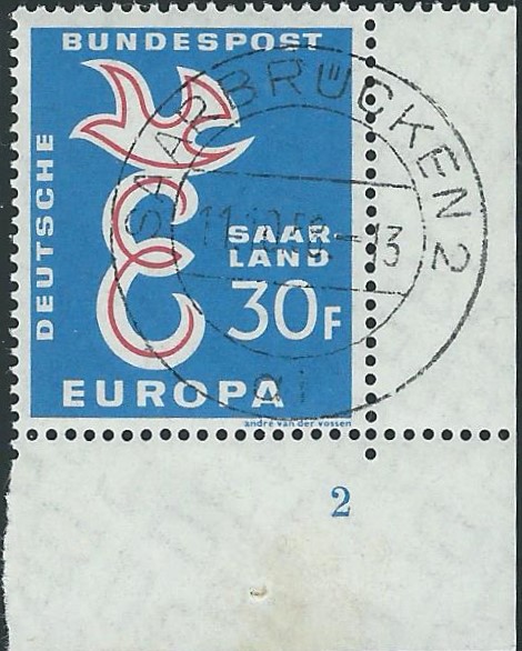 Die Europa-Ausgabe 1958 ist auch wieder mit mehreren Stücken vertreten. Der Wert zu 12 Fr. (Mi.Nr. 439) aus der rechten oberen Bogenecke liegt mir einmal mit Stempel Saarbücken vom 11.10.58 vor.