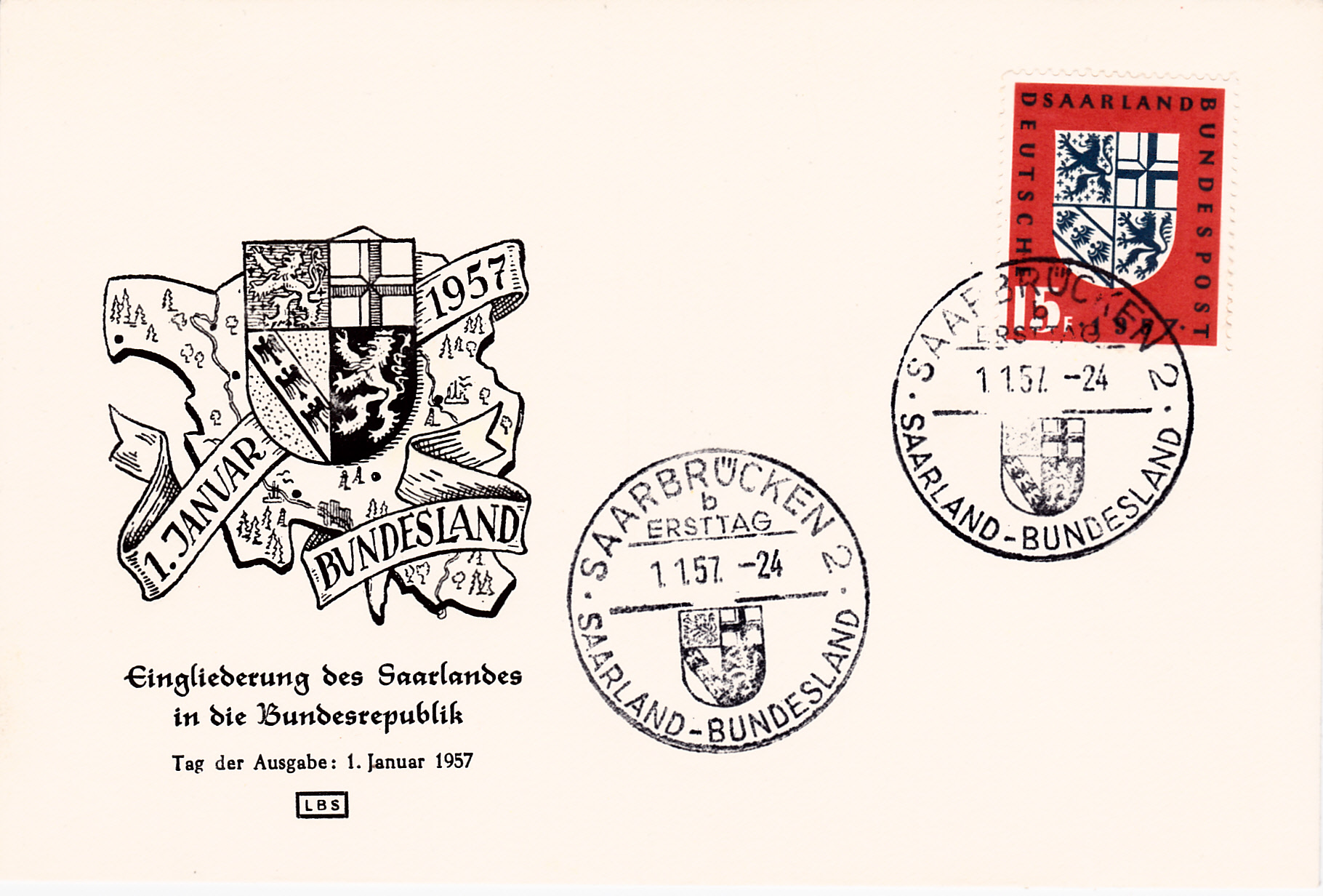 Hier will ich noch ein paar Ergänzungen anfügen. Als erstes einen FDC mit der Marke "Eingliederung des Saarlandes in die Bundesrepublik Deutschland" mit dem Ersttagstempel mit dem Kennbuchstaben "c" wie im vorhergehenden Beitrag von Rüdiger.