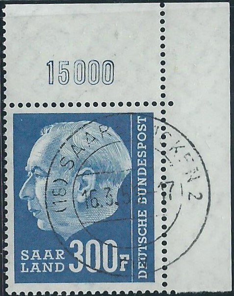 Der Wert zu 300 Fr. aus der rechten oberen Bogenecke mit Stempel Saarbrücken vom 16.3.59