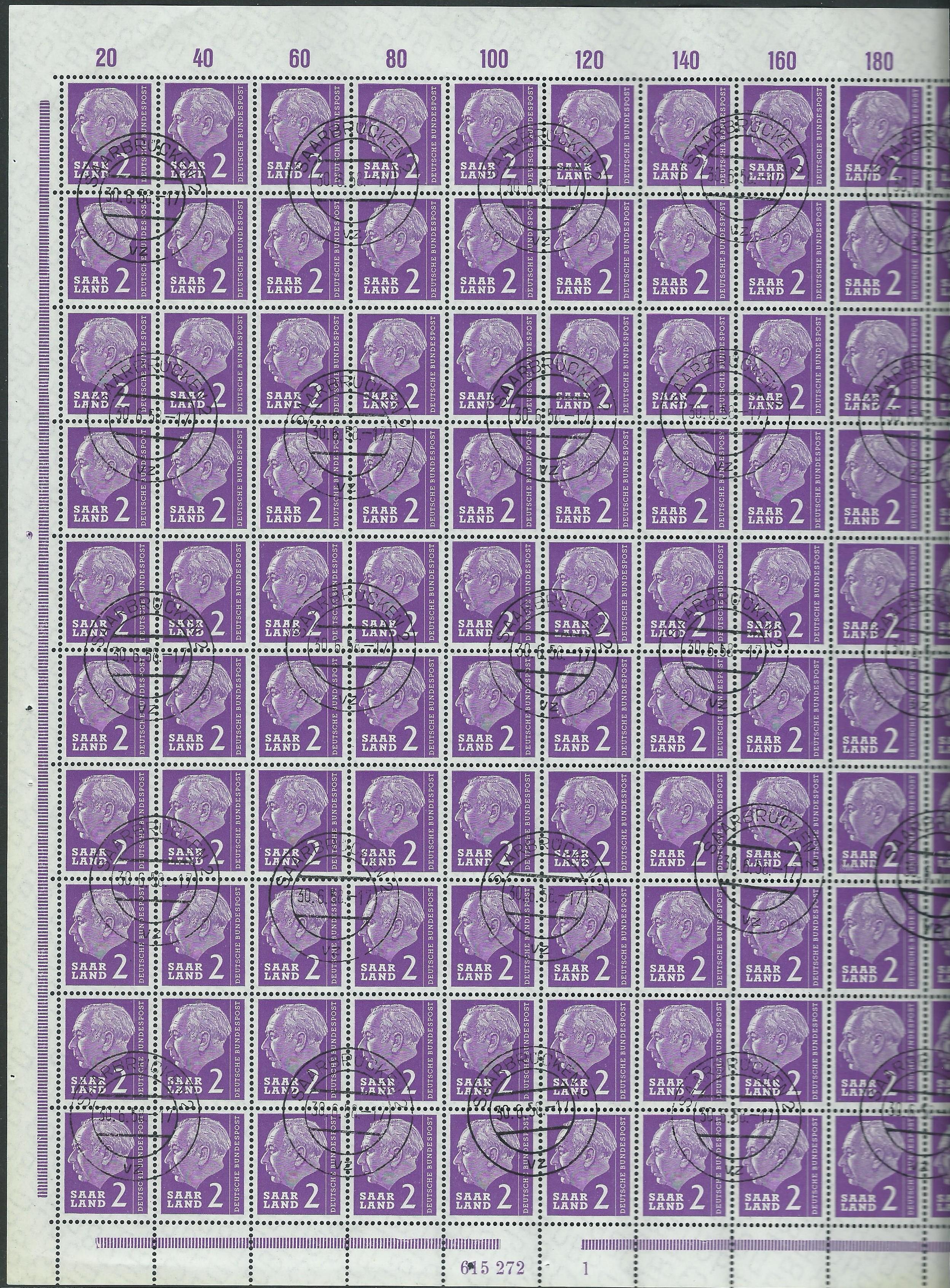 Der Wert zu 1 Fr. liegt mir im Bogen mit der Hausauftragsnummer (HAN) 615271 2 vor. Gestempelt wurde er in Saarbrücken am 30.6.58