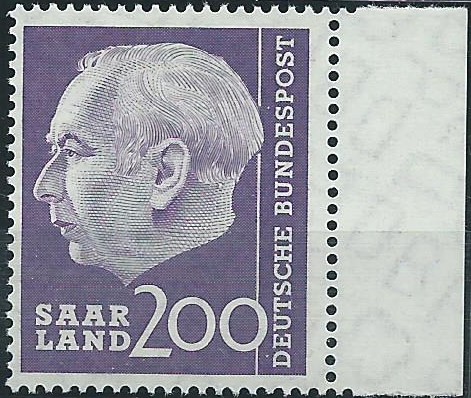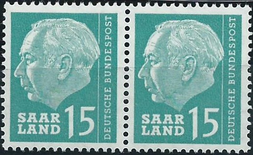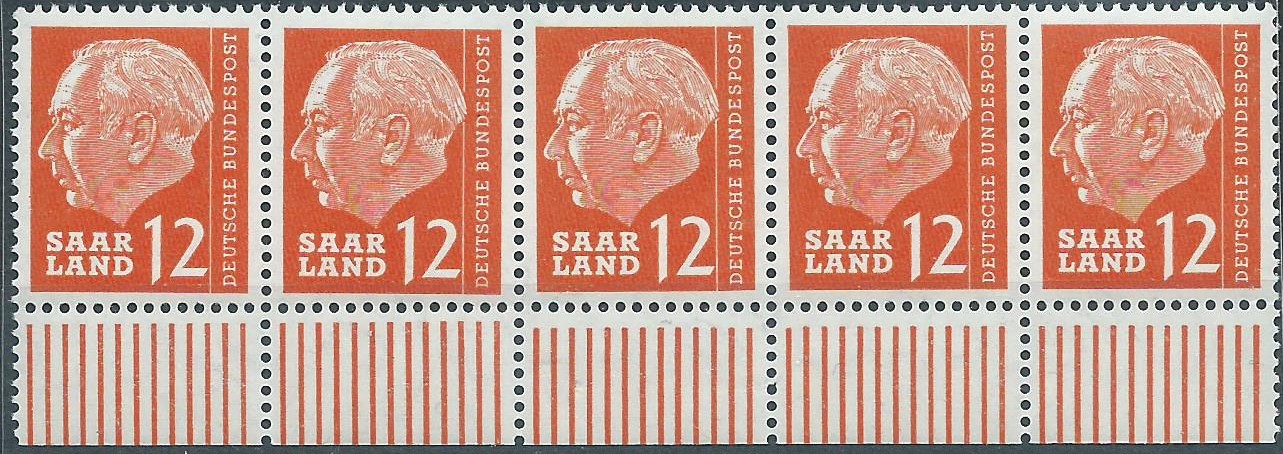 Und Heuss ohne F 12 Fr als waagerechter 5-er-Streifen vom Unterrand. Interessant hierbei ist ein sogenannter Klischee-Versatz zwischen der 2. Und 3. Marke von links. Die Walzenstriche stehen links etwas höher als auf dem rechten Feld. Das passiert immer zwischen Feld 5 und 6 im Oberrand und zwischen Feld 95 und 96 im Unterrand. Die Klischees auf der Druckplatte sind immer im fünfer-Satz nebeneinander gehalten, daher kommen die Unterschiede mal mehr und mal weniger stark sichtbar zustande.