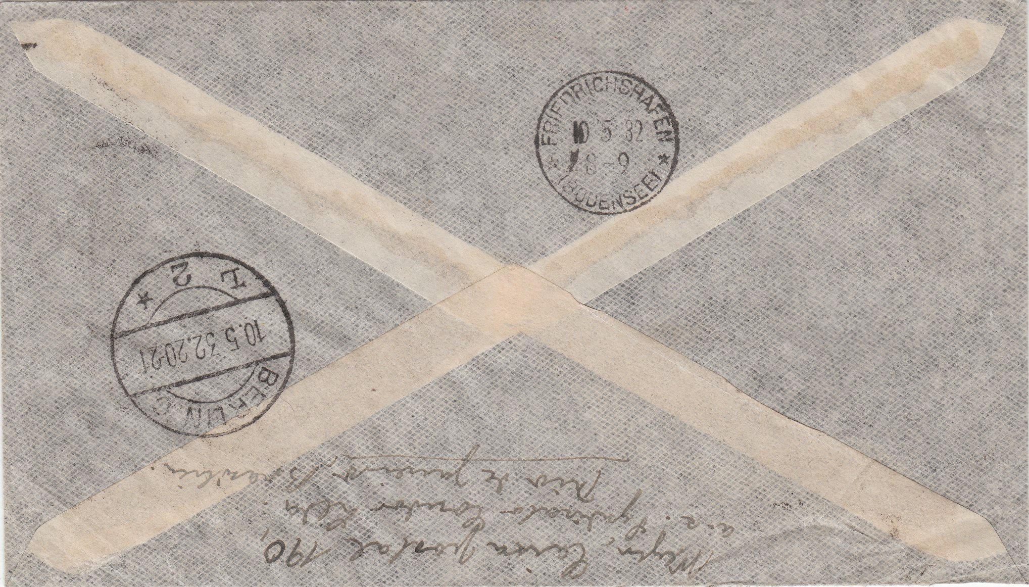 Der nach Wesermünde adressierte Brief wurde dann per Luftpost von Friedrichshafen nach Berlin abgeleitet, wo am 10.05.1932 um 20-21 Uhr ein Tagesstempel als Durchgangsstempel abgeschlagen wurde.