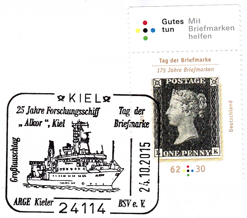 Sonderstempel vom 24.10.2015 aus 24114 Kiel zum Tag der Briefmarke 2015 und zum Jubiläum 25 Jahre Forschungsschiff "Alkor" mit einer Abbildung des Schiffes im Stempelbild.