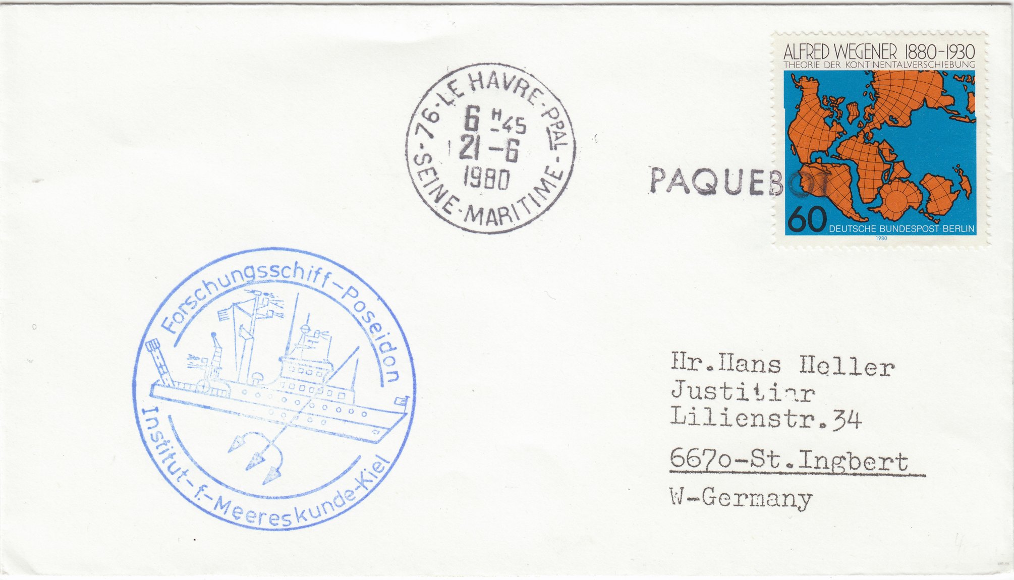 Hier ein an Bord der POSEIDON aufgegebener Beleg mit deutscher Frankatur, der am 21.06.1980 in LE HAVRE der französischen Post übergeben wurde, wobei die deutsche Frankatur mit einem Stempel "PAQUEBOT" entwertet wurde: