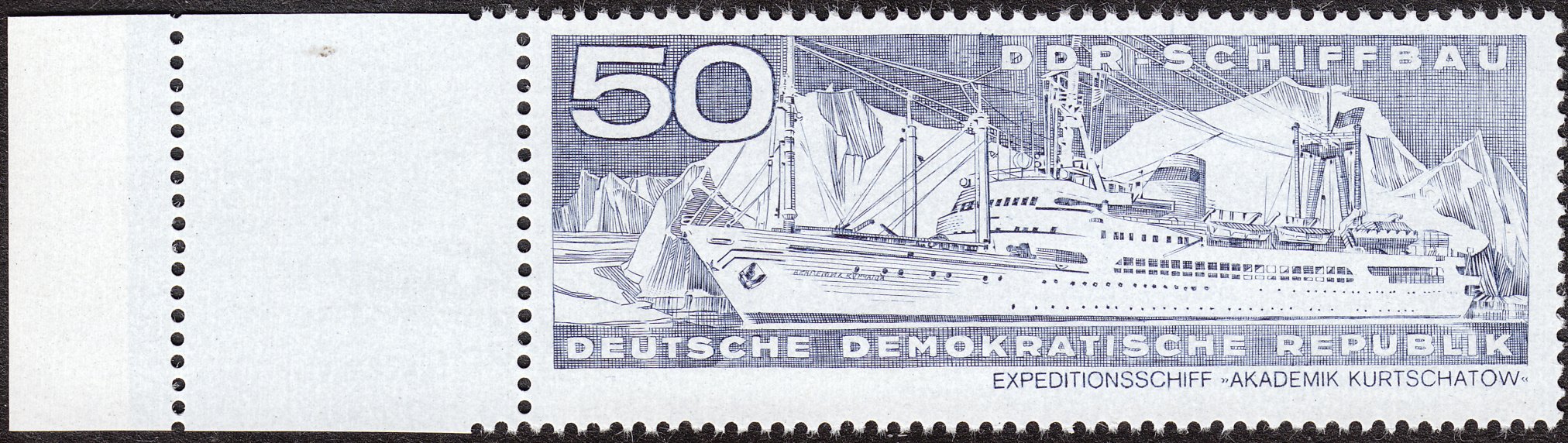 Das Expeditionsschiff "AKADEMIK KURTSCHATOW" wurde mit dieser am 24.08.1971 erschienenen Sondermarke der DDR gewürdigt: