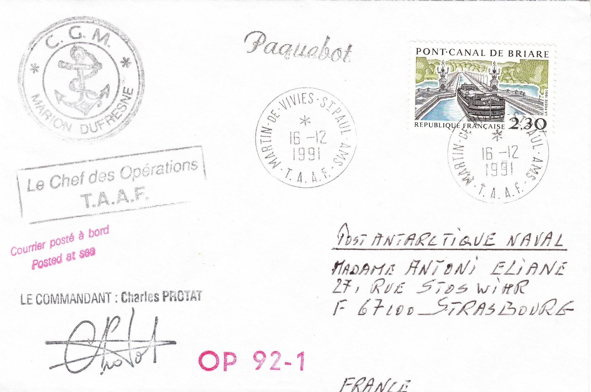 Dieser Beleg wurde während der Operation "OP 92-1" an Bord der MARION DUFRESNE 1 aufgegeben und trägt einen Stempel des Kommandanten "Charles PROTAT".