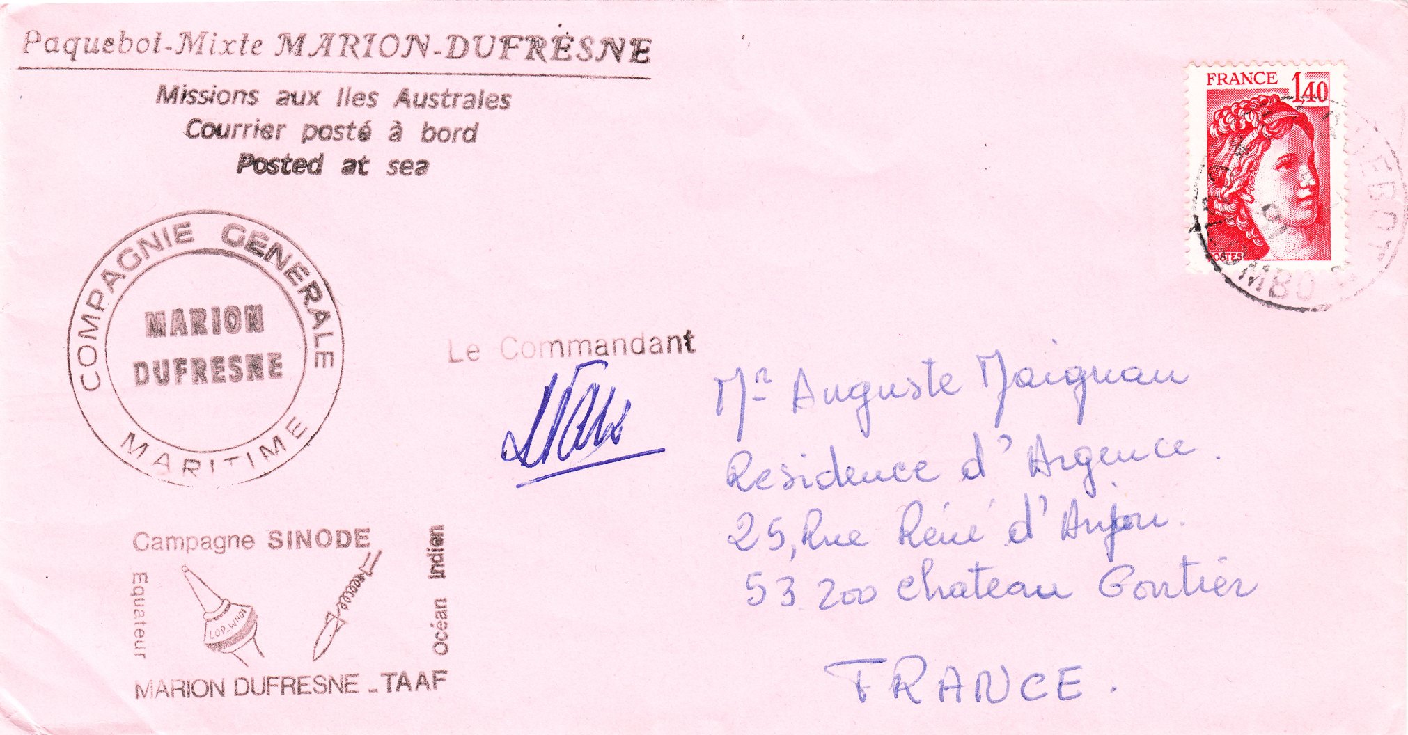 Dieser Brief wurde während der "Campagne Synode" an Bord der MARION DUFRESNE 1 aufgegeben und trägt einen Stempel "Le Commandant" mit handschriftlicher Unterschrift:
