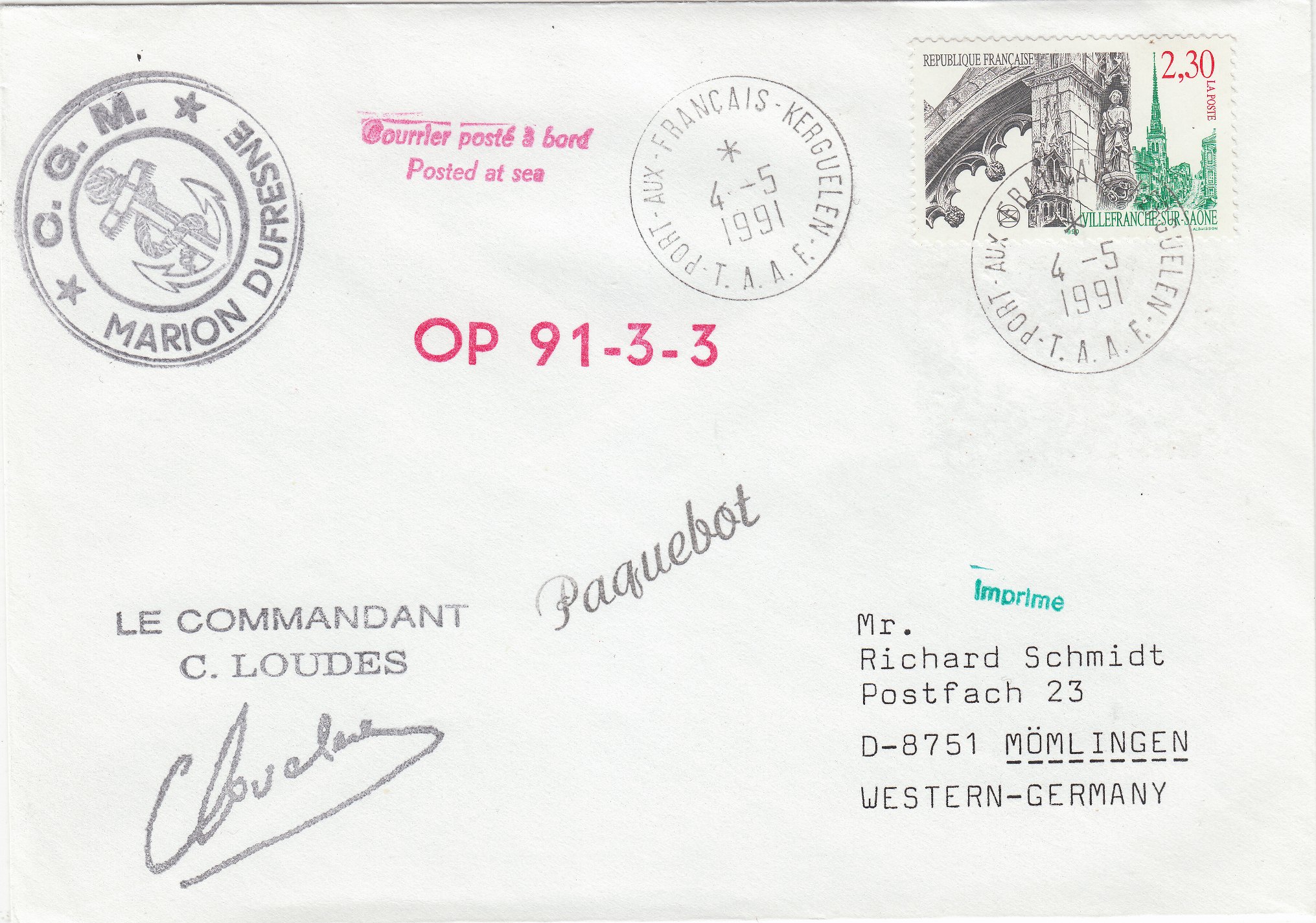Dieser Beleg wurde während der Operation "OP 91-3-3" an Bord der MARION DUFRESNE aufgegeben und trägt einen Stempel des Kommandanten "C. LOUDES".