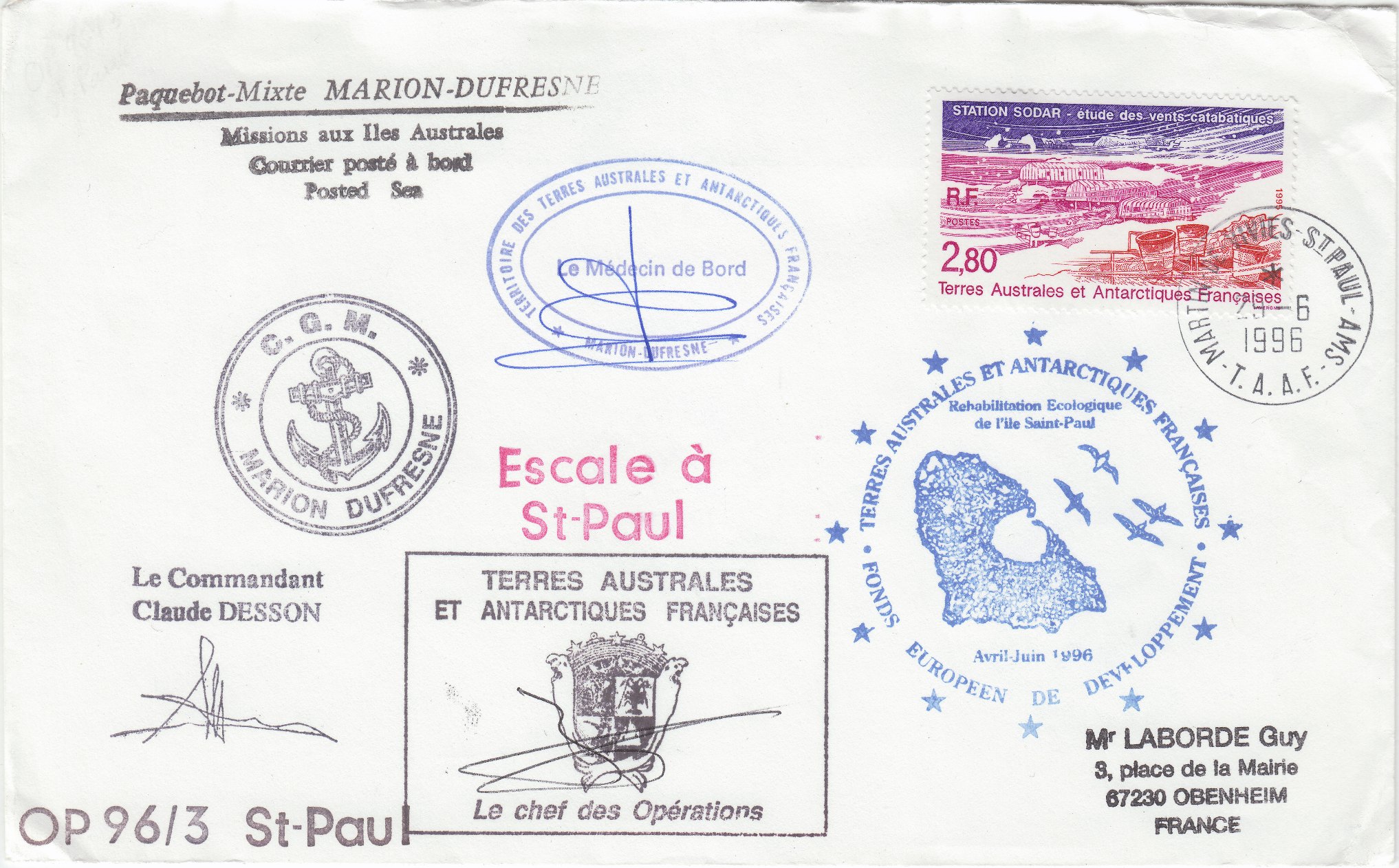Dieser während der Operation "OP 96/3" an Bord der MARION DUFRESNE 2 aufgegebene Beleg trägt einen Stempel "Le Commandant Claude DESSON". Der Beleg wurde auf St. Paul in der Forschungsstation Martin de Viviès der Post von TAAF übergeben, die am 29.06.1996 die Frankatur mit Tagesstempel entwertete: