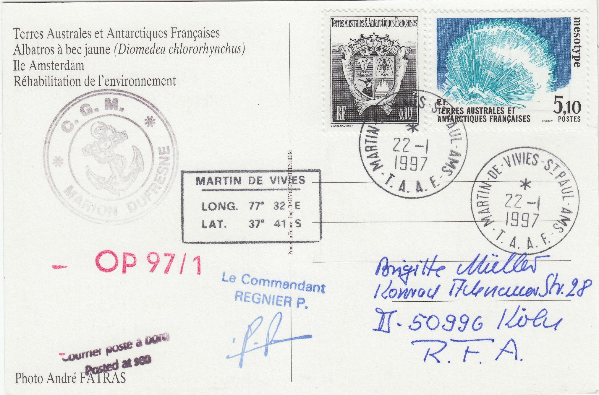 Diese Postkarte wurde während der Operation "OP 97/1" an Bord der MARION DUFRESNE 2 aufgegeben und trägt einen Stempel "Le Commandant REGNIER P.".