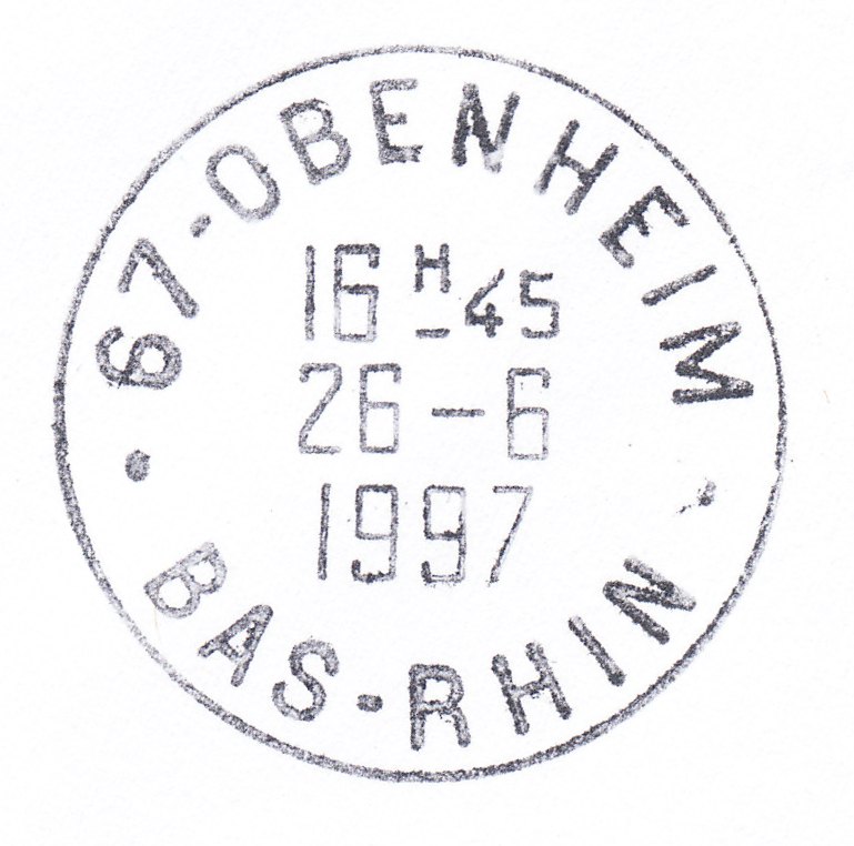 Am 26.06.1997 kam der Beleg dann laut rückseitigem Ankunftsstempel im französischen OBENHEIM an: