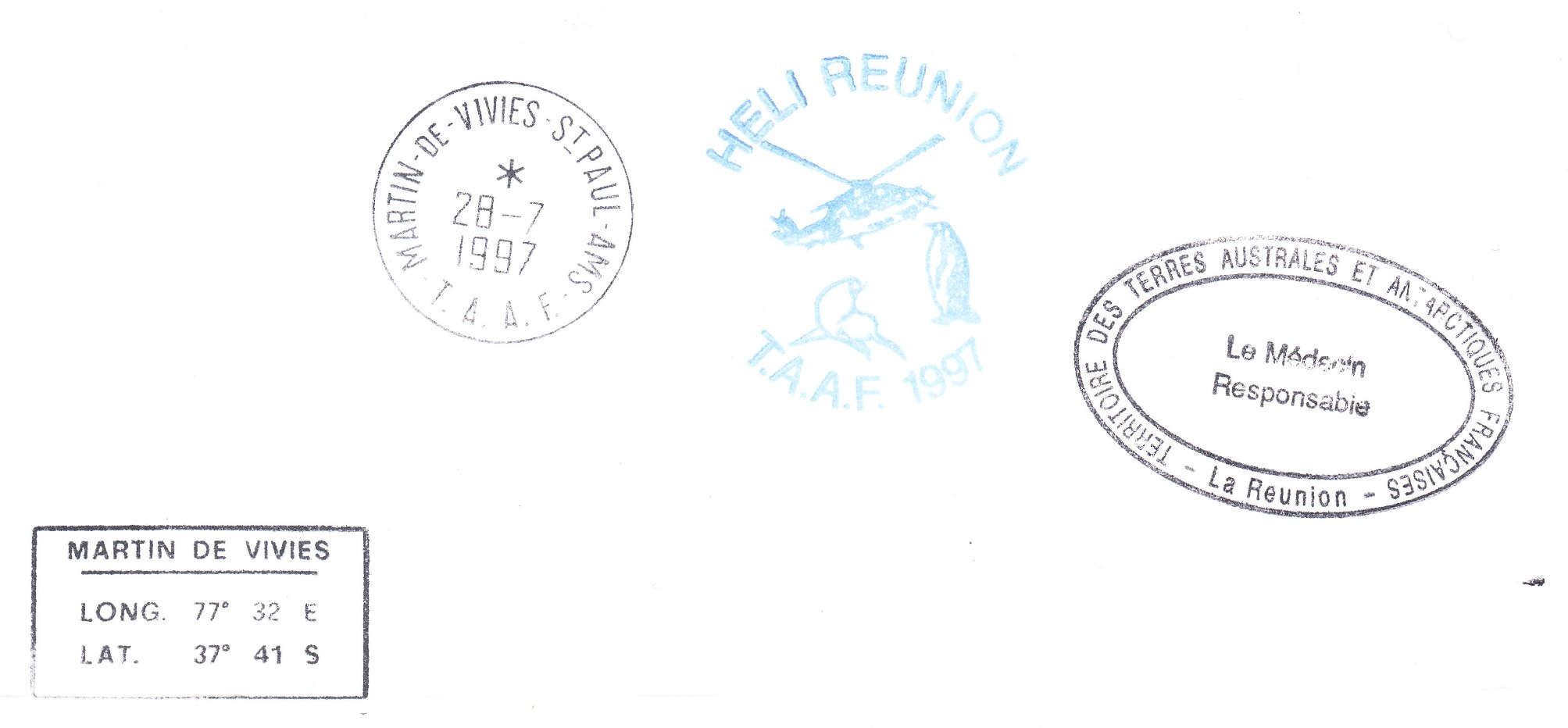 Bei einem Zwischenstopp auf der Amsterdaminsel = ESCALE AMSTERDAM wurde der Beleg der Post von TAAF zur Weiterbeföderung übergeben und die Frankatur wurde am 28.07.1997 per Tagesstempel in MARTIN DE VIVIES entwertet.