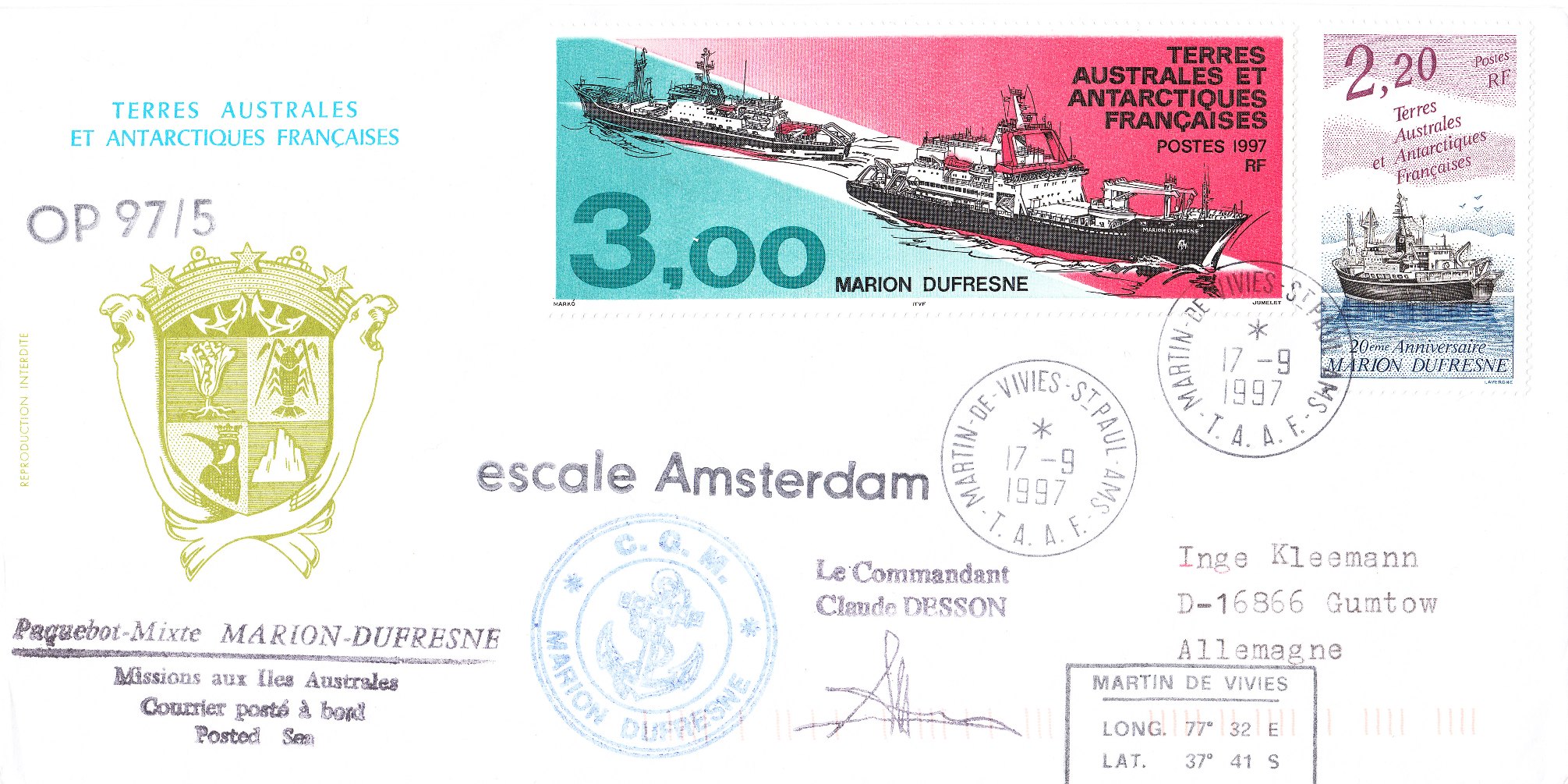 Dieser Beleg wurde während der Operation "OP 97/5" an Bord der MARION DUFRESNE 2 aufgegeben und trägt einen Stempel "Le Commandant Claude DESSON":