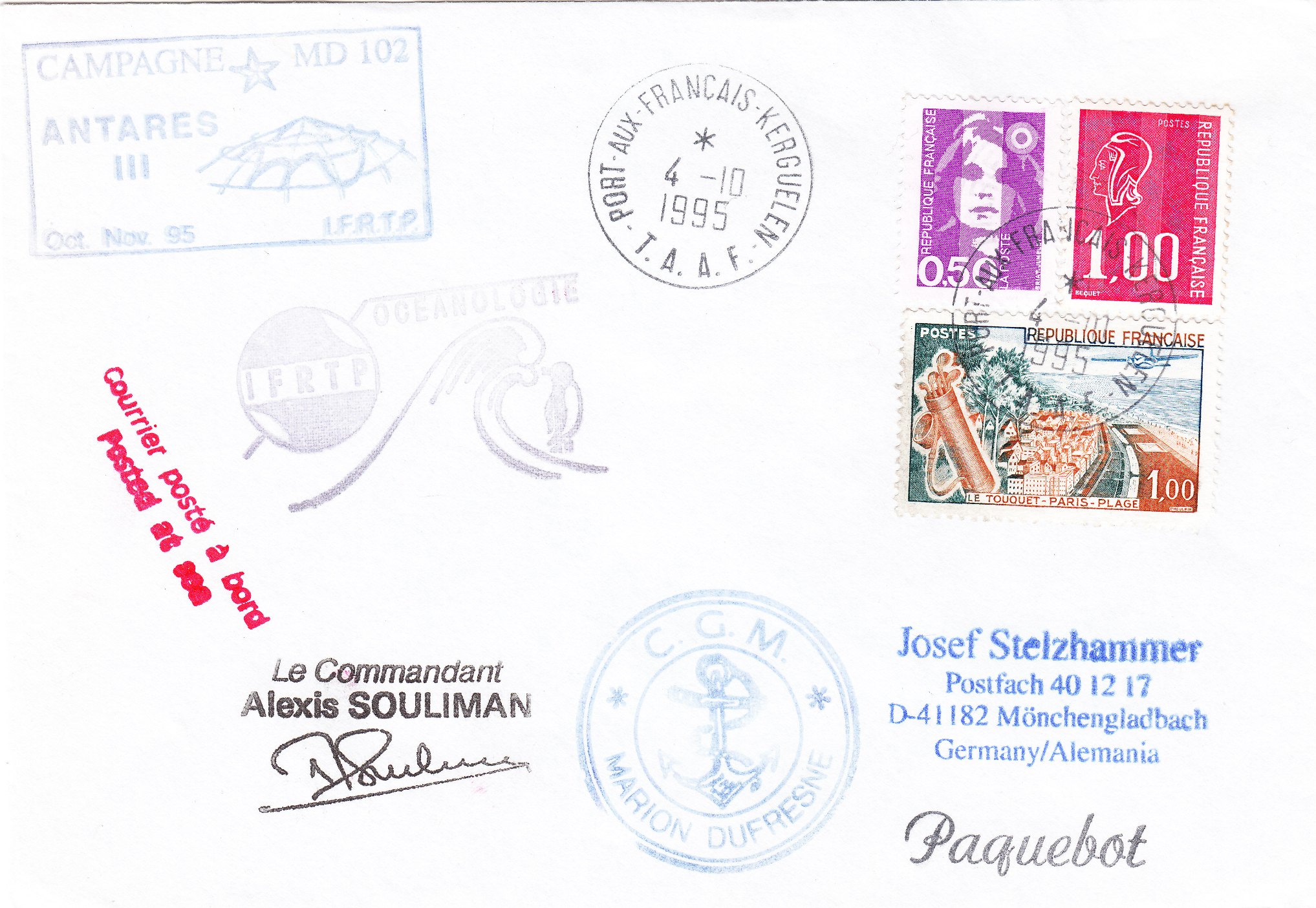 Der Beleg wurde am 04.10.1995 in der ganzjährig besetzten französischen Forschungsstation Port-aux-Français auf den Kergueleninseln der Post von TAAF zur Weiterbeförderung übergeben und die Frankatur wurde mit einem entsprechenden Tagesstempel entwertet.