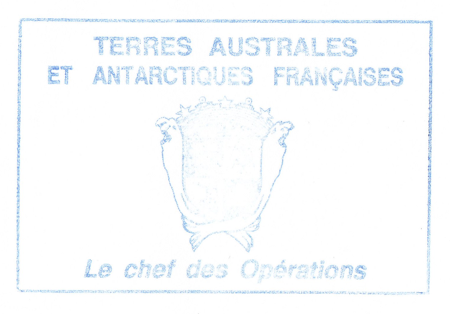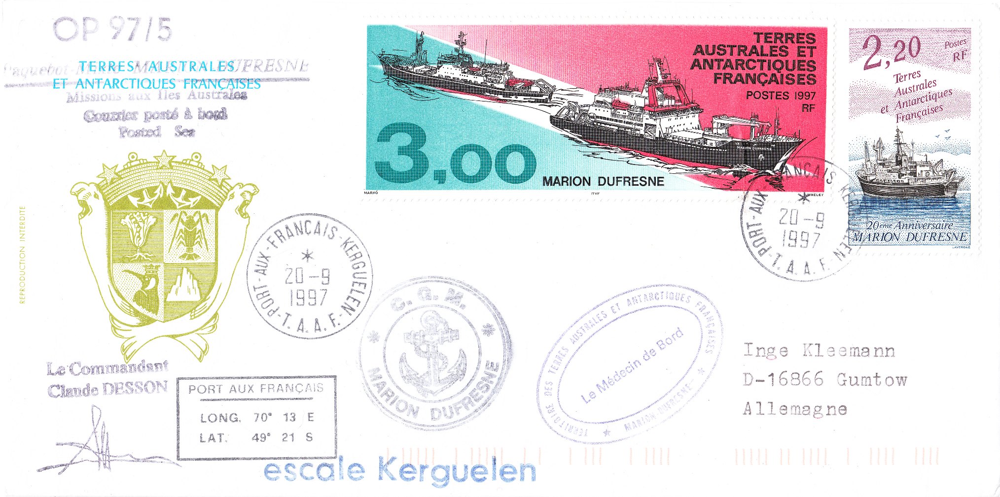 Dieser Beleg wurde während der Operation "OP 97/5" an Bord der MARION DUFRESNE 2 aufgegeben und trägt einen Stempel "Le Commandant Claude DESSON". Bei einem Zwischenstopp auf den Kergueleninseln = "escale Kerguelen" wurde der Beleg der Post von TAAF zur Weiterbeförderung übergeben und die Frankatur wurde am 20.09.1997 in der französischen Forschungsstation Port-aux-Français per Tagesstempel entwertet: