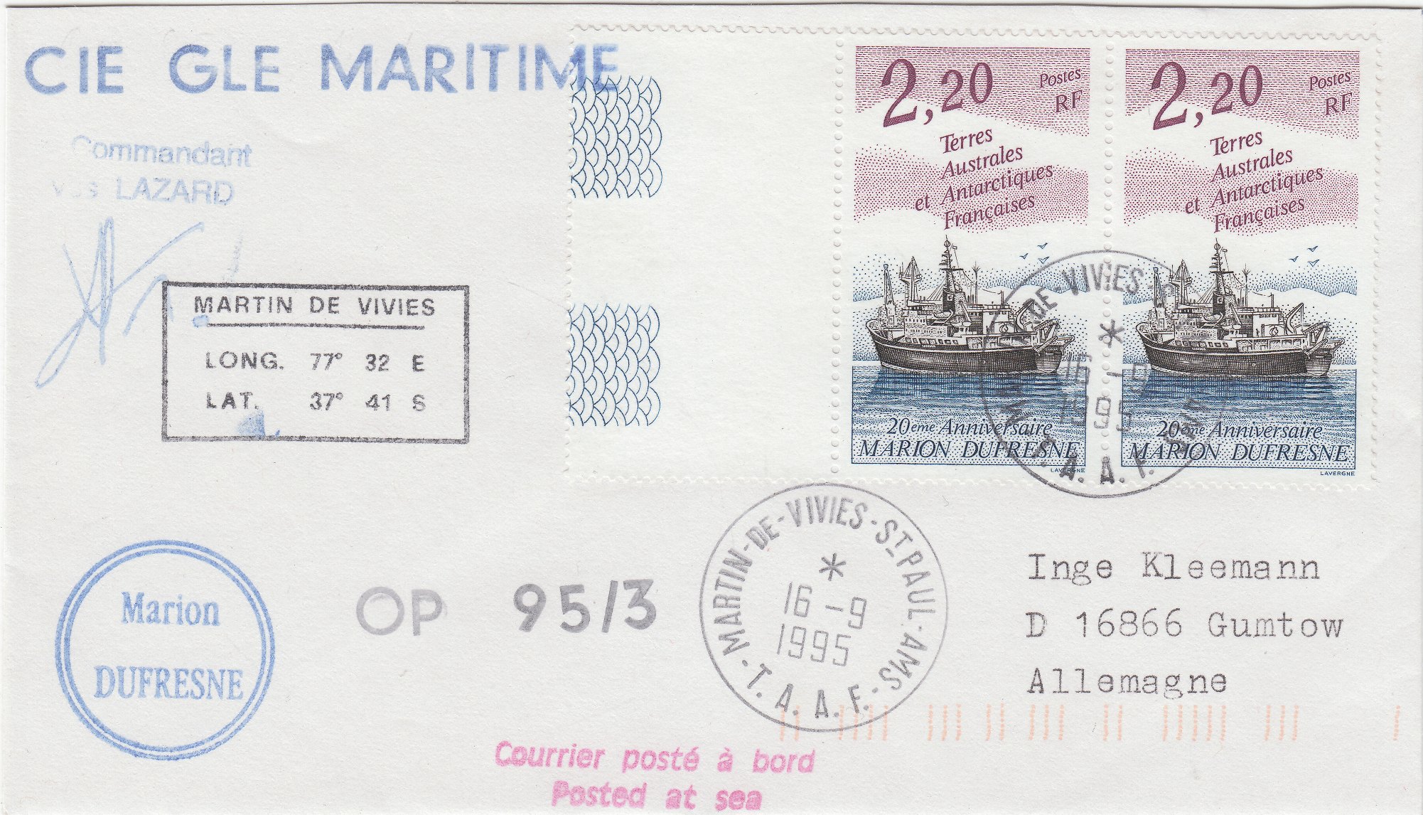Dieser während der Operation "OP 95/3" an Bord der MARION DUFRESNE 2 aufgegebene Beleg wurde am 16.09.1995 in Martin-de-Viviès der Post übergeben: