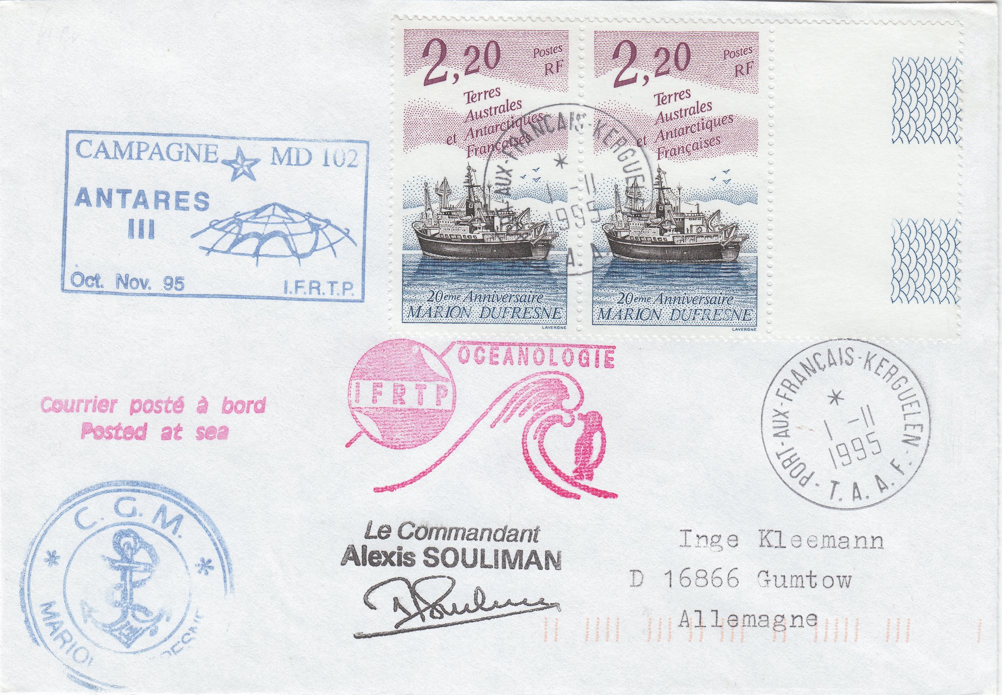 Dieser Beleg wurde an Bord der MARION DUFRESNE 2 aufgegeben und trägt einen Stempel "Le Commandant Alexis SOULIMAN":