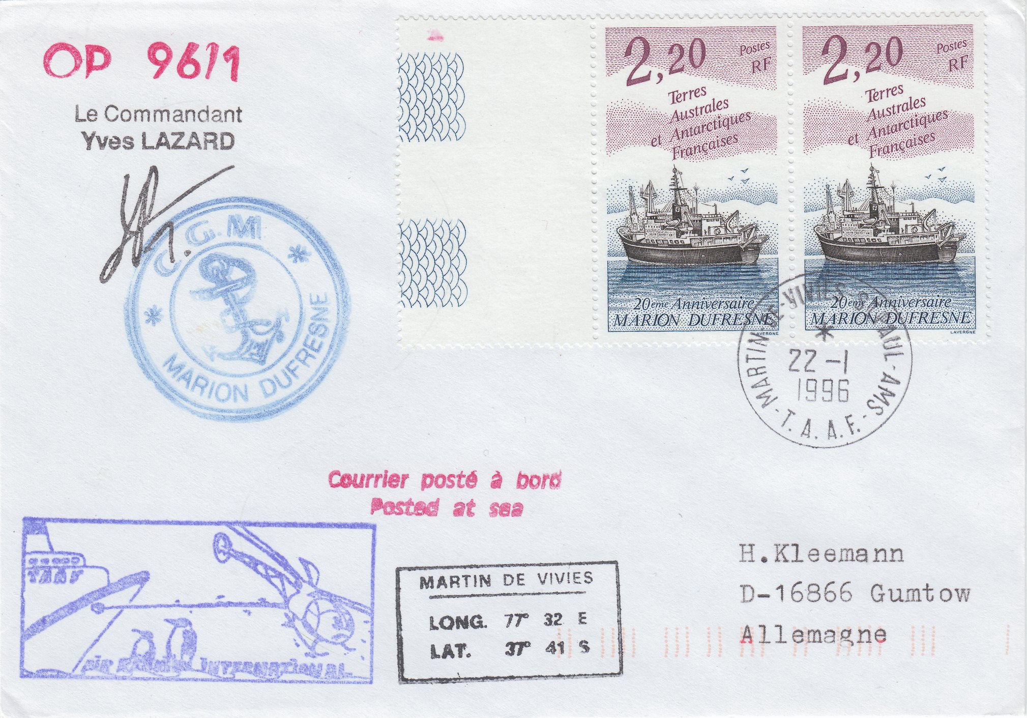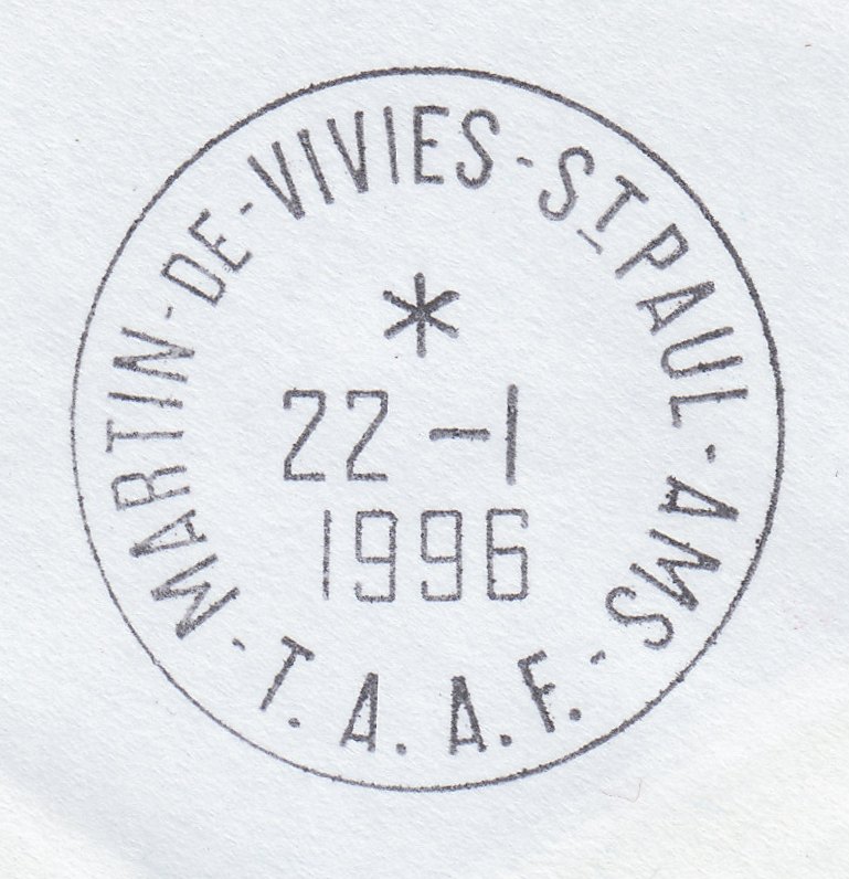 Dieser Beleg wurde während der Operation "OP 96/1" an Bord der MARION DUFRESNE 2 aufgegeben. Am 22.01.1996 wurde er in der Forschungsstation Martin de Viviès auf der Amsterdaminsel der Post von TAAF übergeben, die die Frankatur per Tagesstempel entwertete und noch einen Tagesstempel blanko auf der Rückseite abschlug:
