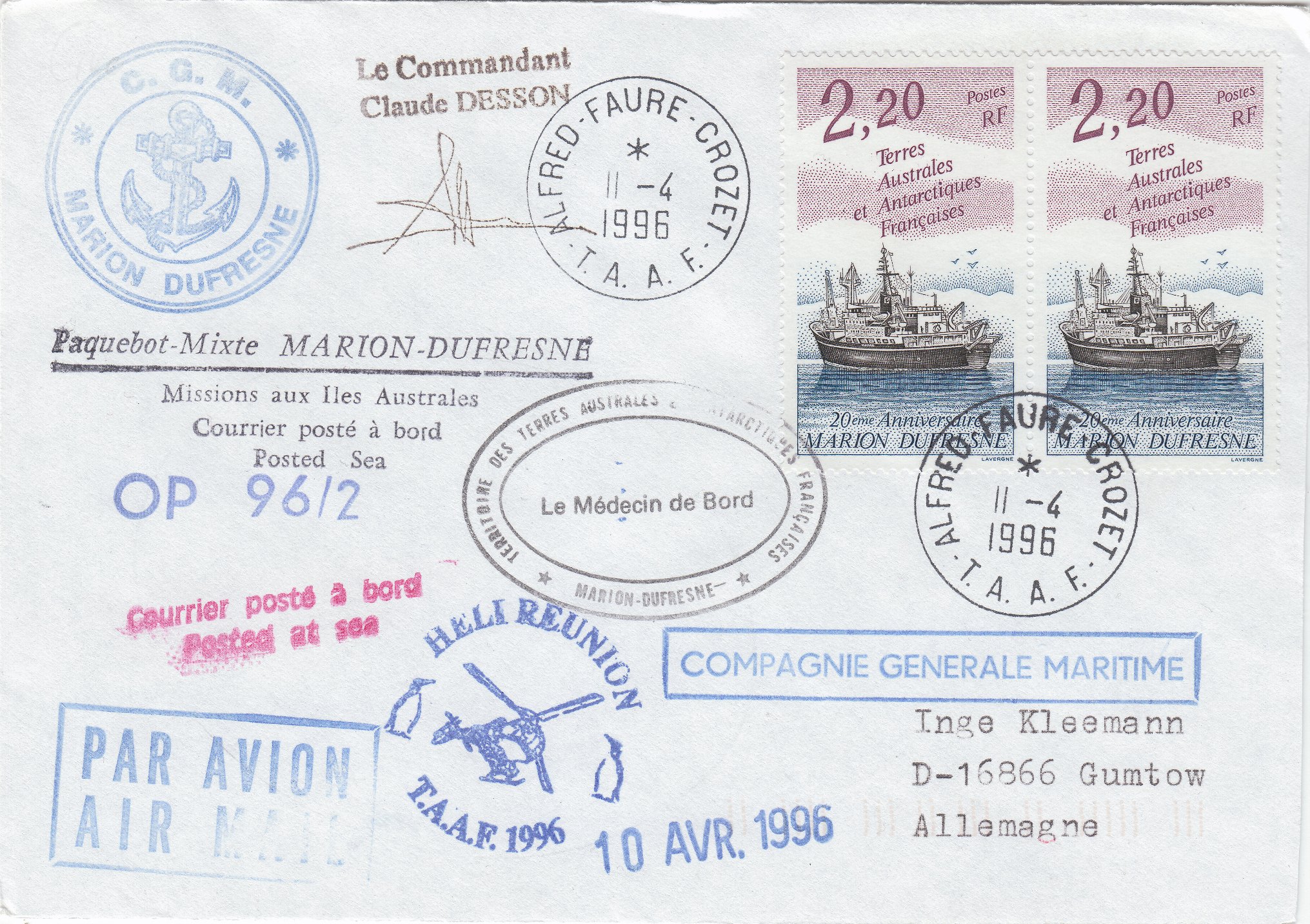 Dieser Beleg wurde während der Operation "OP 96/2" an Bord der MARION DUFRESNE 2 aufgegeben und trägt einen Stempel "Le Commandant Claude DESSON":