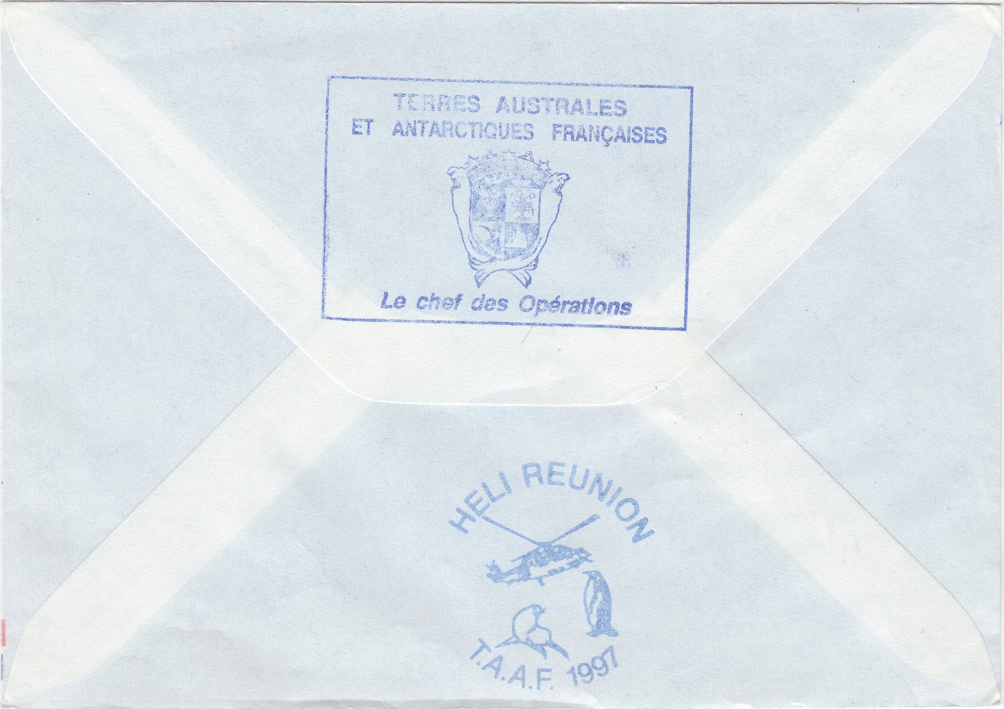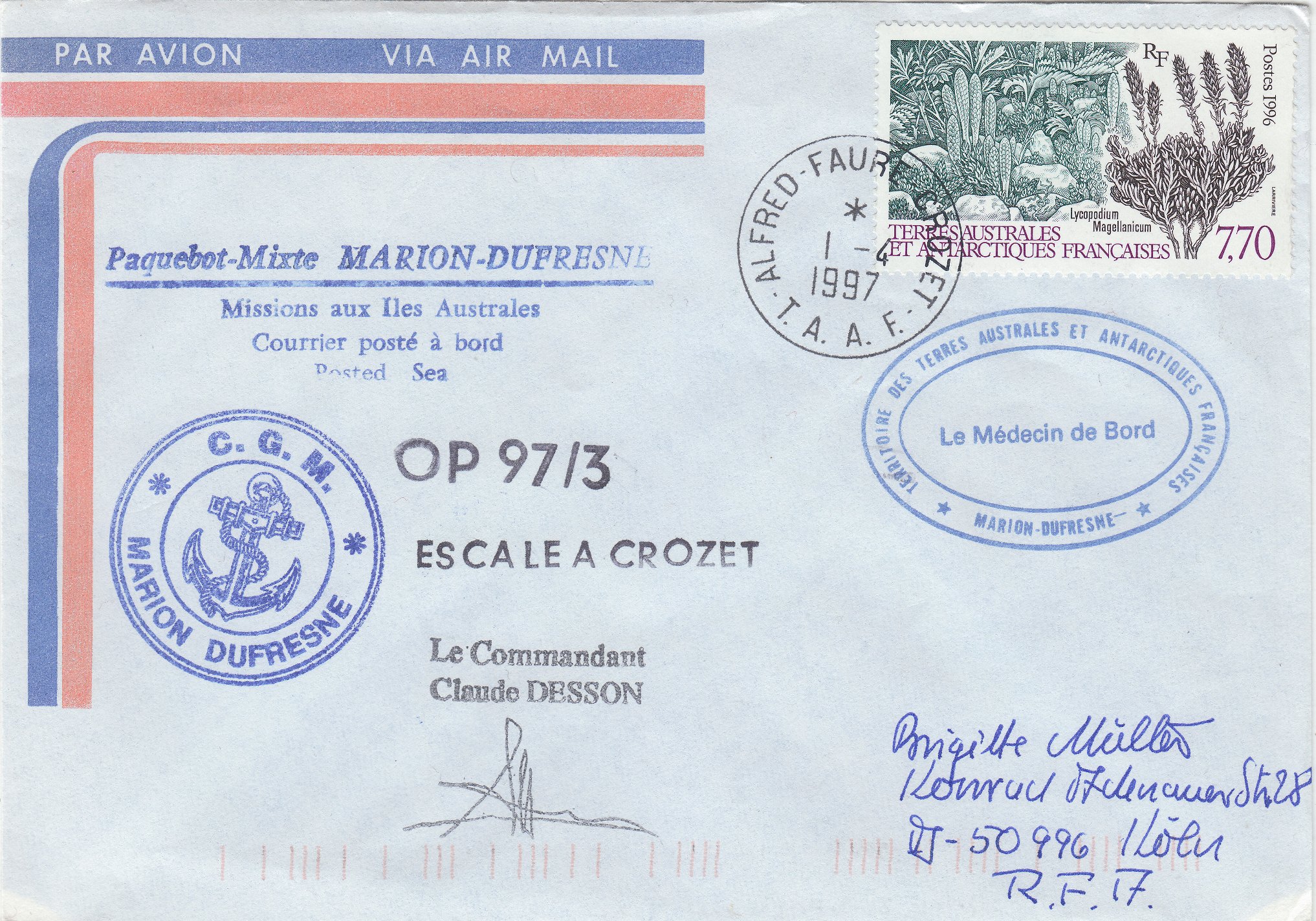 Dieser Beleg wurde während der Operation "OP 97/3" an Bord der MARION DUFRESNE 2 aufgegeben und trägt einen Stempel "Le Commandant Claude DESSON":