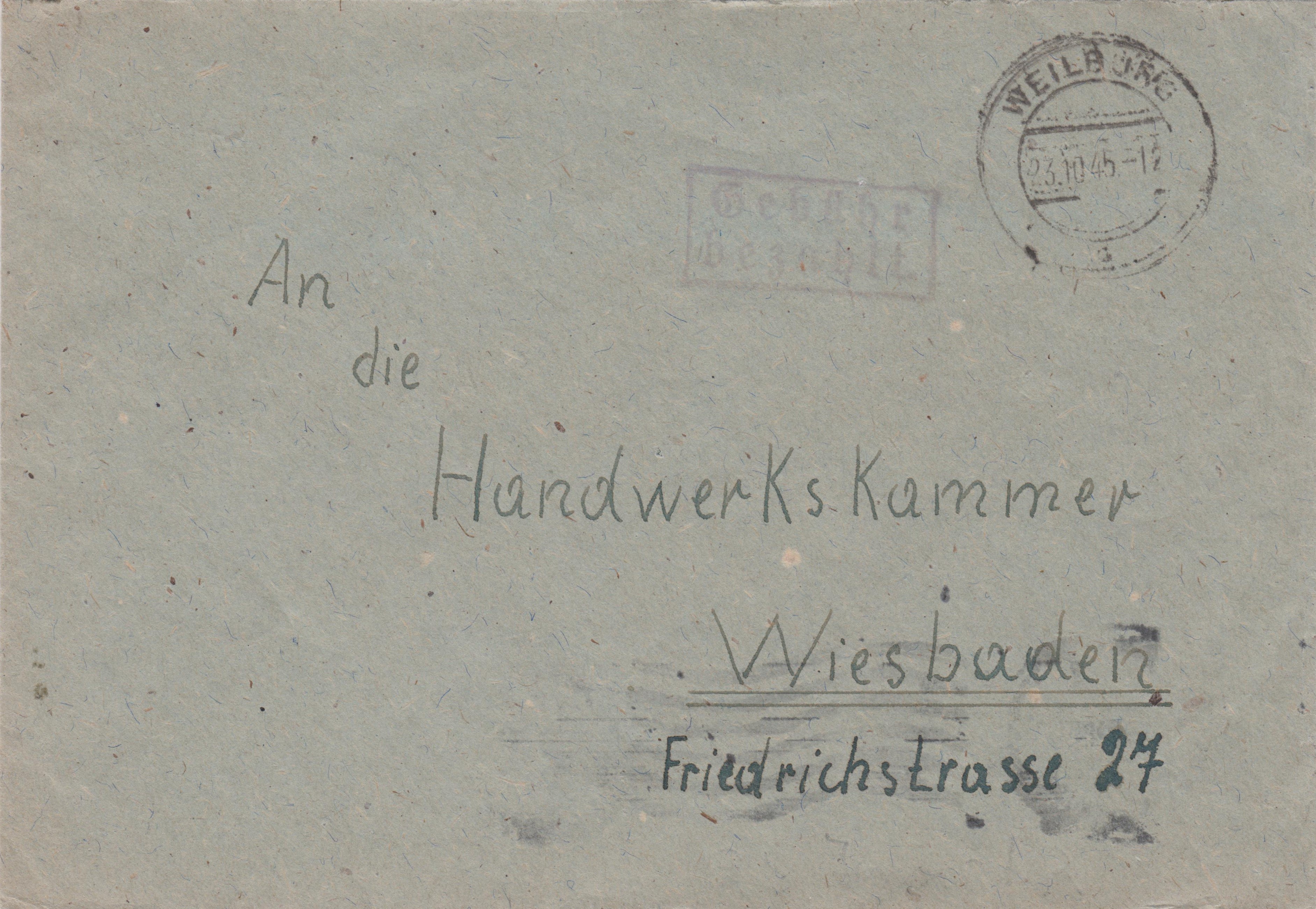 Dieser nach Wiesbaden adressierte Brief wurde am 23.10.1945 in WEILBURG aufgegeben: