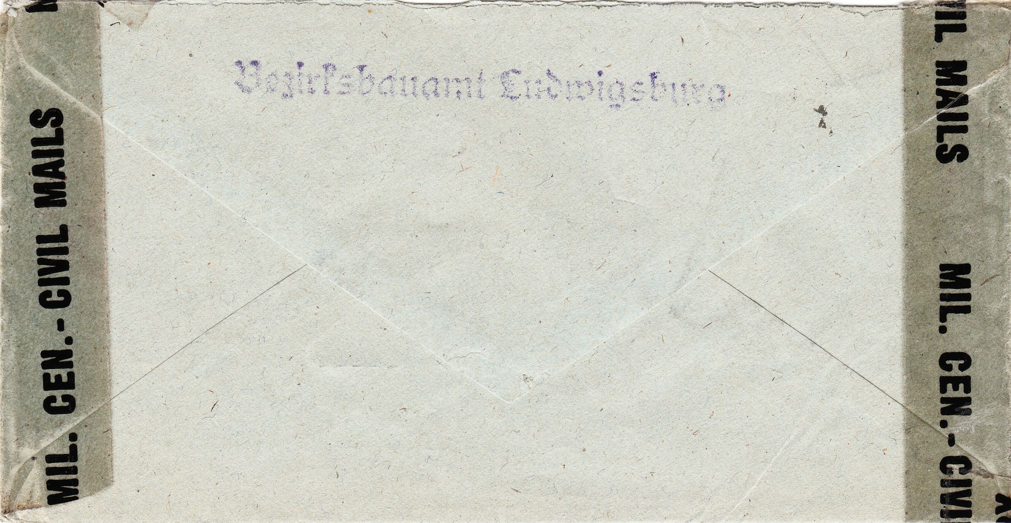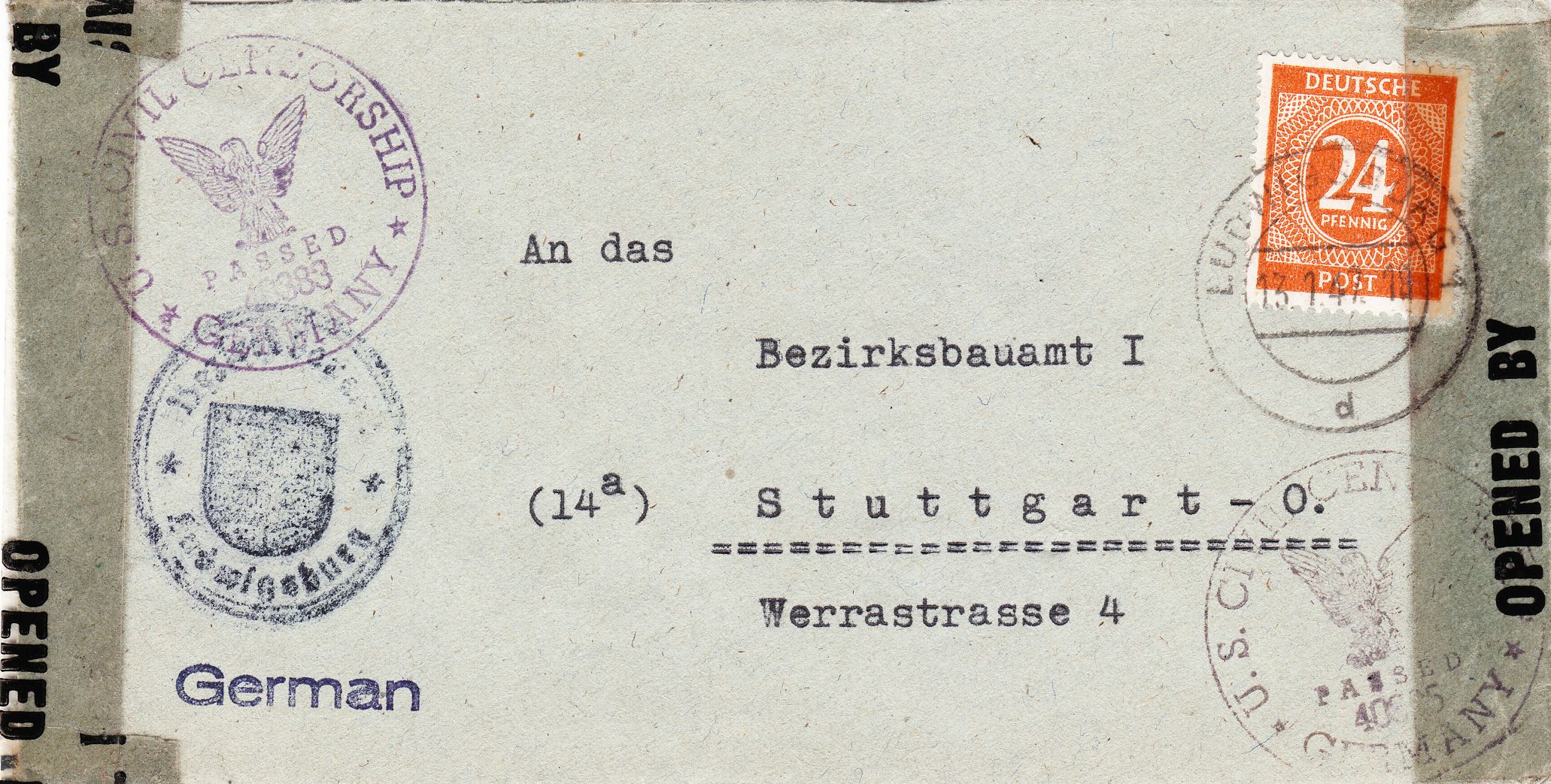 Dieser Fernbrief von Ludwigsburg nach Stuttgart vom 13.01.1947 wurde in der Zensurstelle Esslingen linksseitig sowie rechtsseitig zweimal geöffnet und jeweils mit einem Zellophan-Streifen mit laufendem Aufdruck "OPENED BY/MIL. CEN. -CIVIL MAILS" wieder vorschriftsgemäß verschlossen. Die Zensurstelle lässt sich anhand der Prüfernummern der Prüferstempel bestimmen, denn in Esslingen wurden bei der hier gezeigten Prüferstempeltype A-2 die Nummern des 40 000er-Bereichs verwendet.