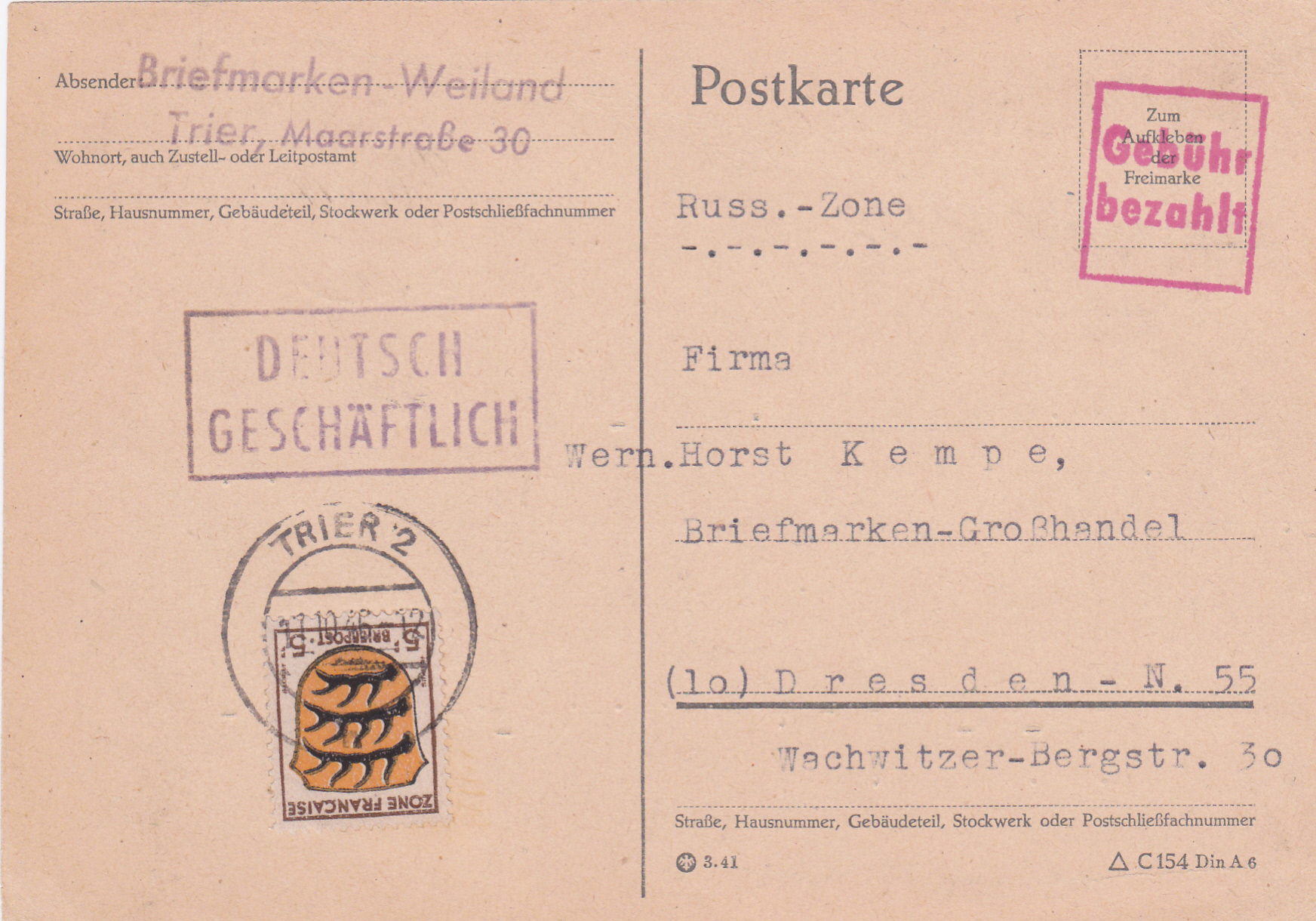 Diese Postkarte von Trier nach Dresden vom 11.10.1946 wurde mit einer Marke zu 5Pf (MiNr 3) der allgemeinen Ausgabe für die französische Zone frankiert. Da eine Postkarte zu dieser Zeit 12Pf kostete, wurde der Betrag von 7Pfbei der Einlieferung der Karte am Postschalter bar erhoben und mit dem "Gebühr bezahlt" bestätigt.