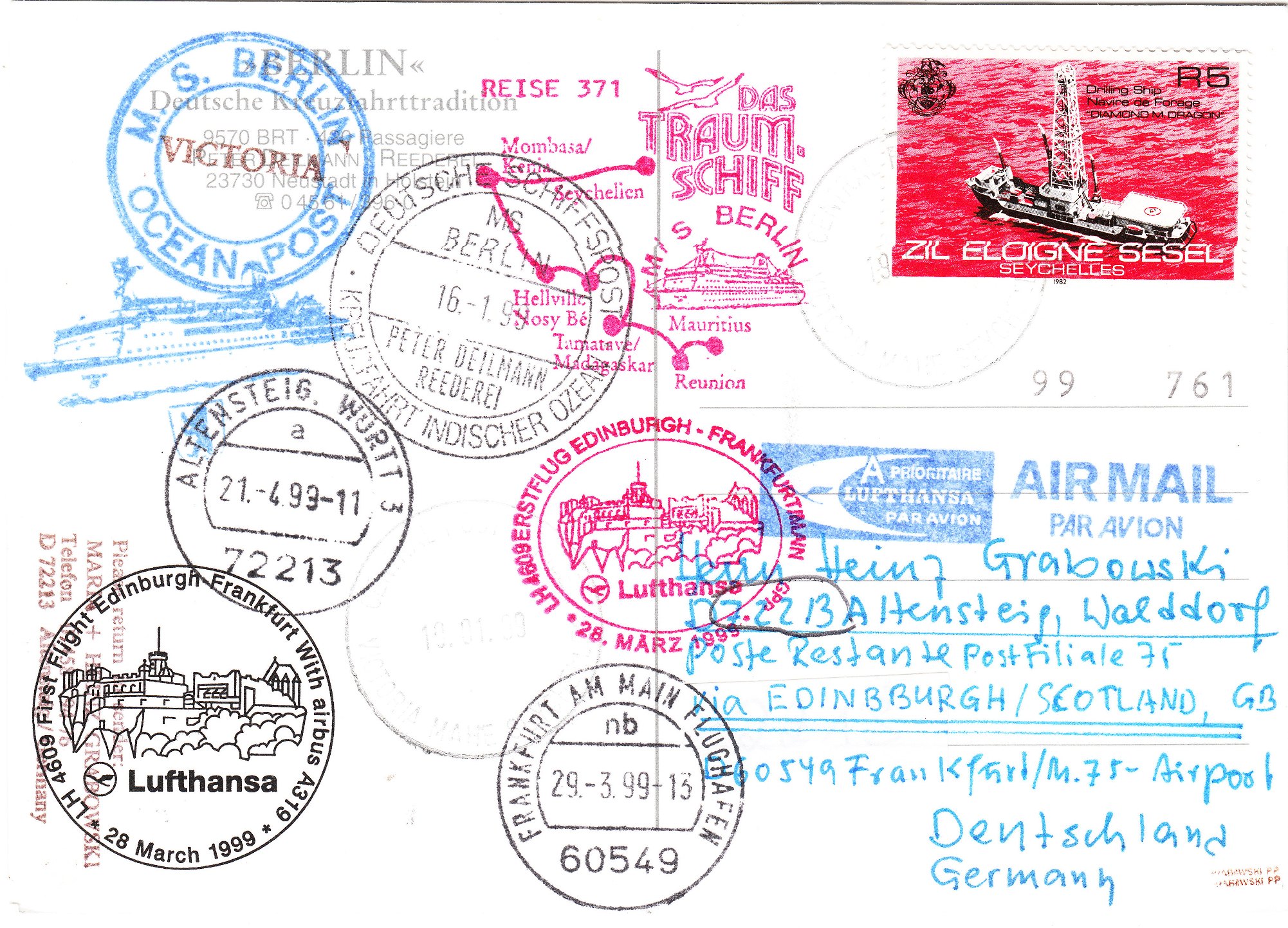 Am 19.01.1999 wurde der Beleg in Victoria auf Mahé, der Hauptinsel der Seychellen der dortigen Post übergeben und die Frankatur wurde per Tagesstempel "CENTRAL POST OFFICE VICTORIA MAHE SEYCHELLES" entwertet.