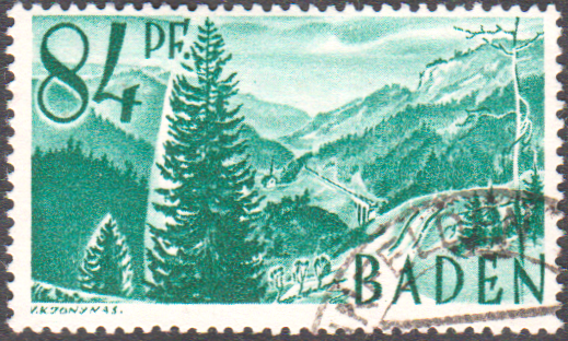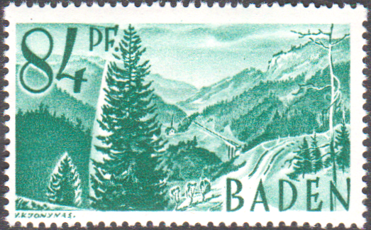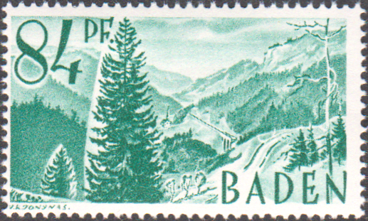 Eckrandstück vom linken unteren Bogenrand. Unterhalb dieser Marke befindet sich bei Marken im Großformat der Französischen Zone immer die Bogenzählnummer. Vorangestellt ist jeweils der Buchstabe A oder B zur Unterscheidung der jeweils nebenander gedruckten Bogenpaare. Hier handelt es sich um den linken Bogen, der jeweils der "A"-Bogen ist.